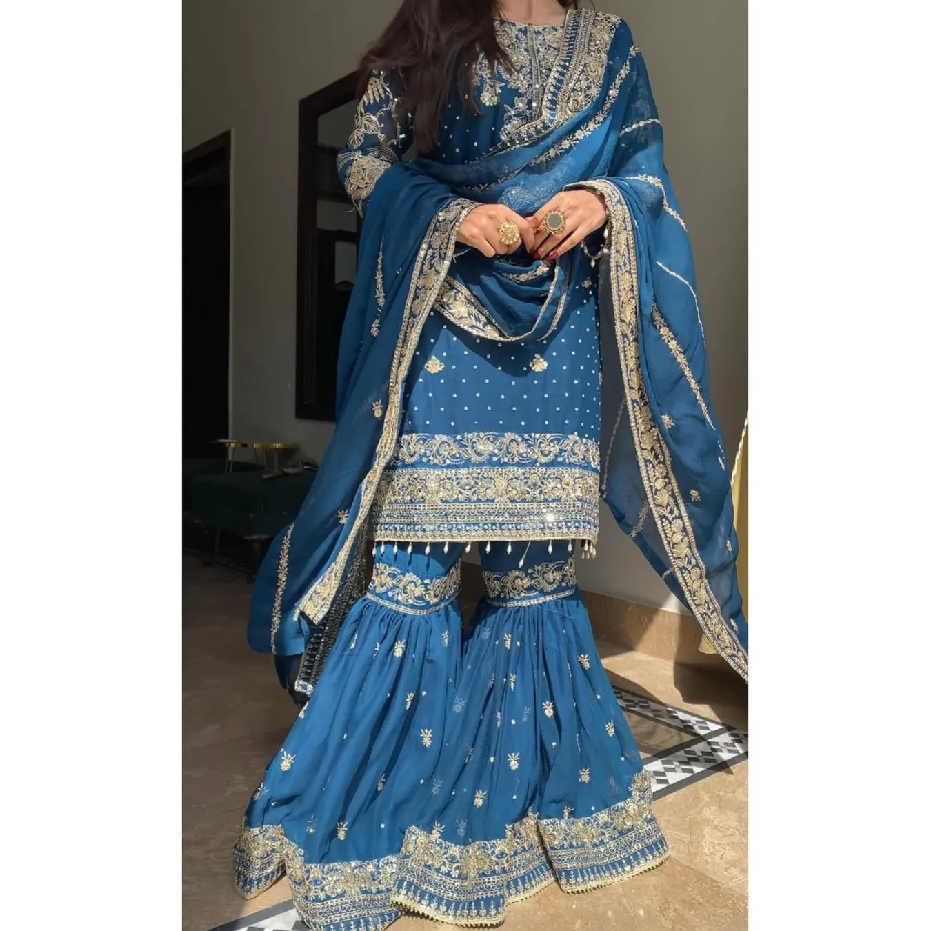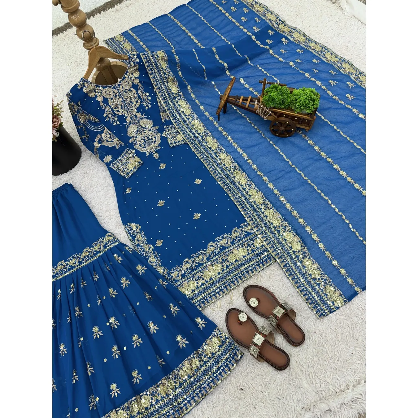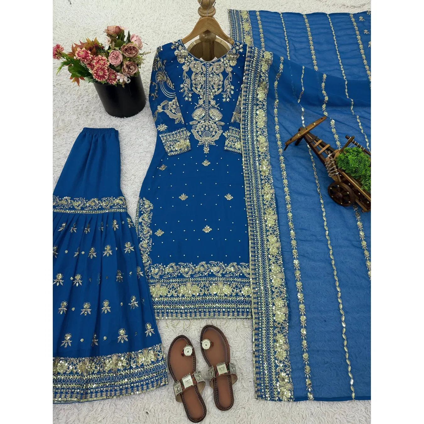 | Fabric Description | Top : Heavy Faux Georgette With 5mm Embroidery Sequence Work With Full Sleeve Top Inner : Heavy Micro Cotton Sharara Plazzo : Heavy Faux Georgette With 5mm Embroidery Sequence With Fully Flair Plazzo Inner : Heavy Micro Cotton Dupatta : Heavy Georgette With and Embroidery Sequence Work And Lace Border |