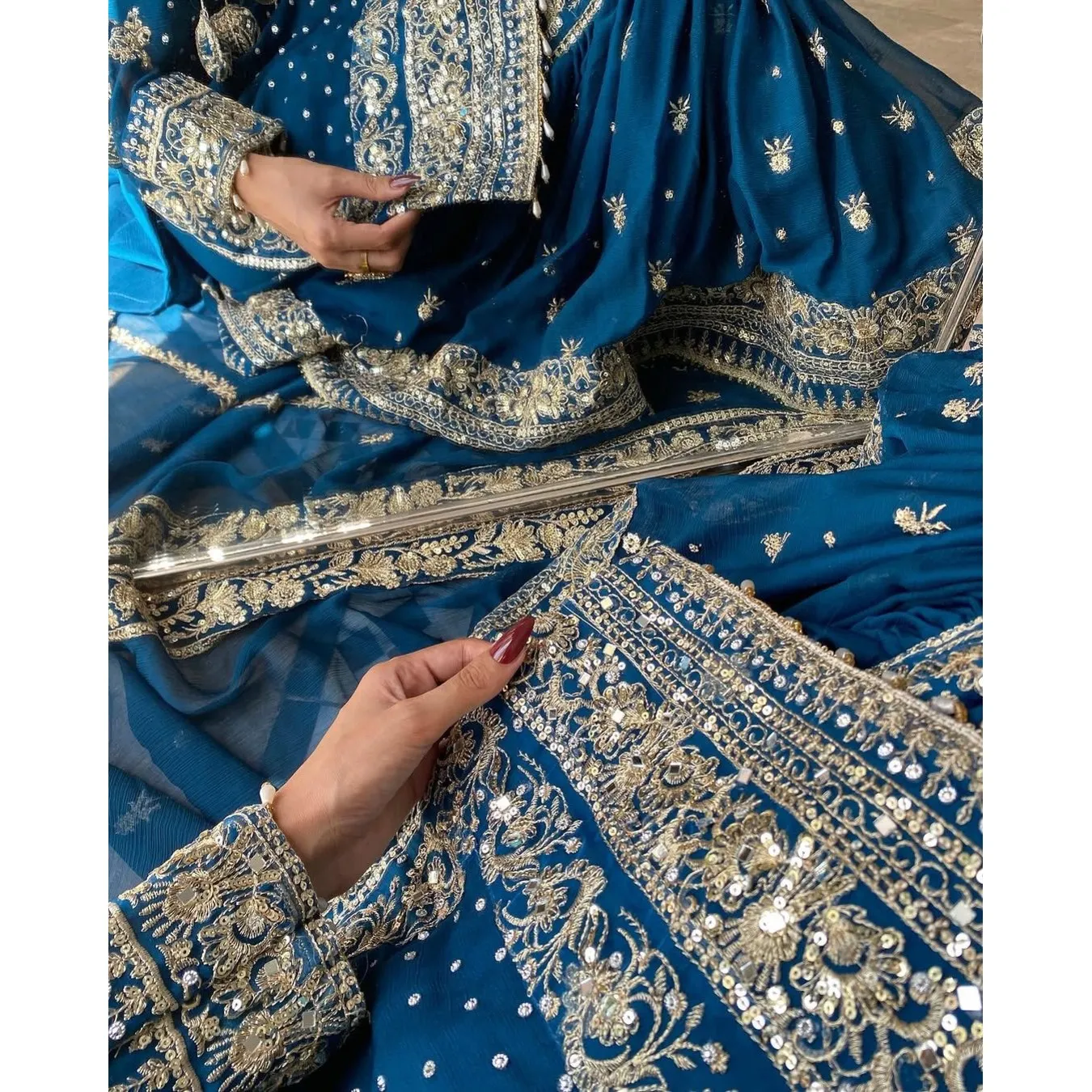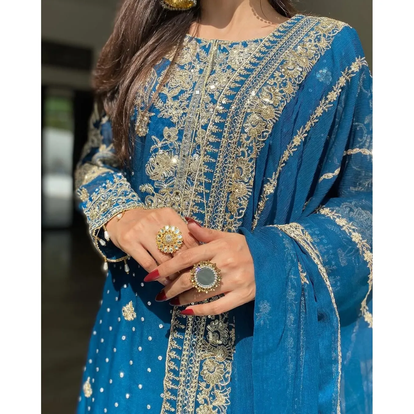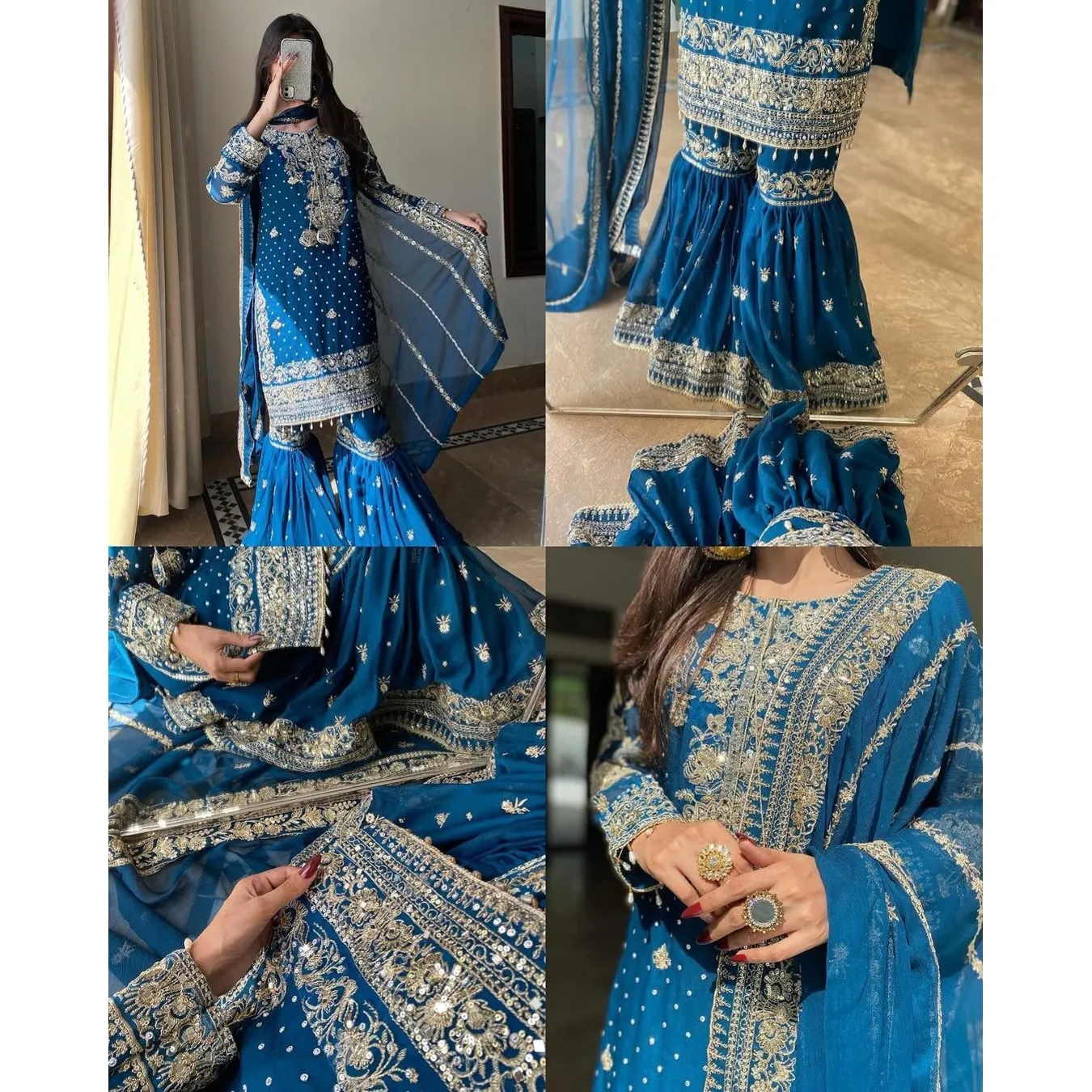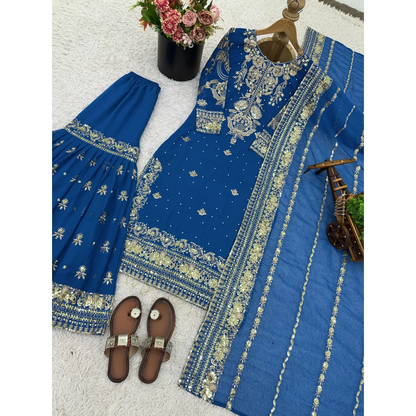 | Fabric Description | Top : Heavy Faux Georgette With 5mm Embroidery Sequence Work With Full Sleeve Top Inner : Heavy Micro Cotton Sharara Plazzo : Heavy Faux Georgette With 5mm Embroidery Sequence With Fully Flair Plazzo Inner : Heavy Micro Cotton Dupatta : Heavy Georgette With and Embroidery Sequence Work And Lace Border |