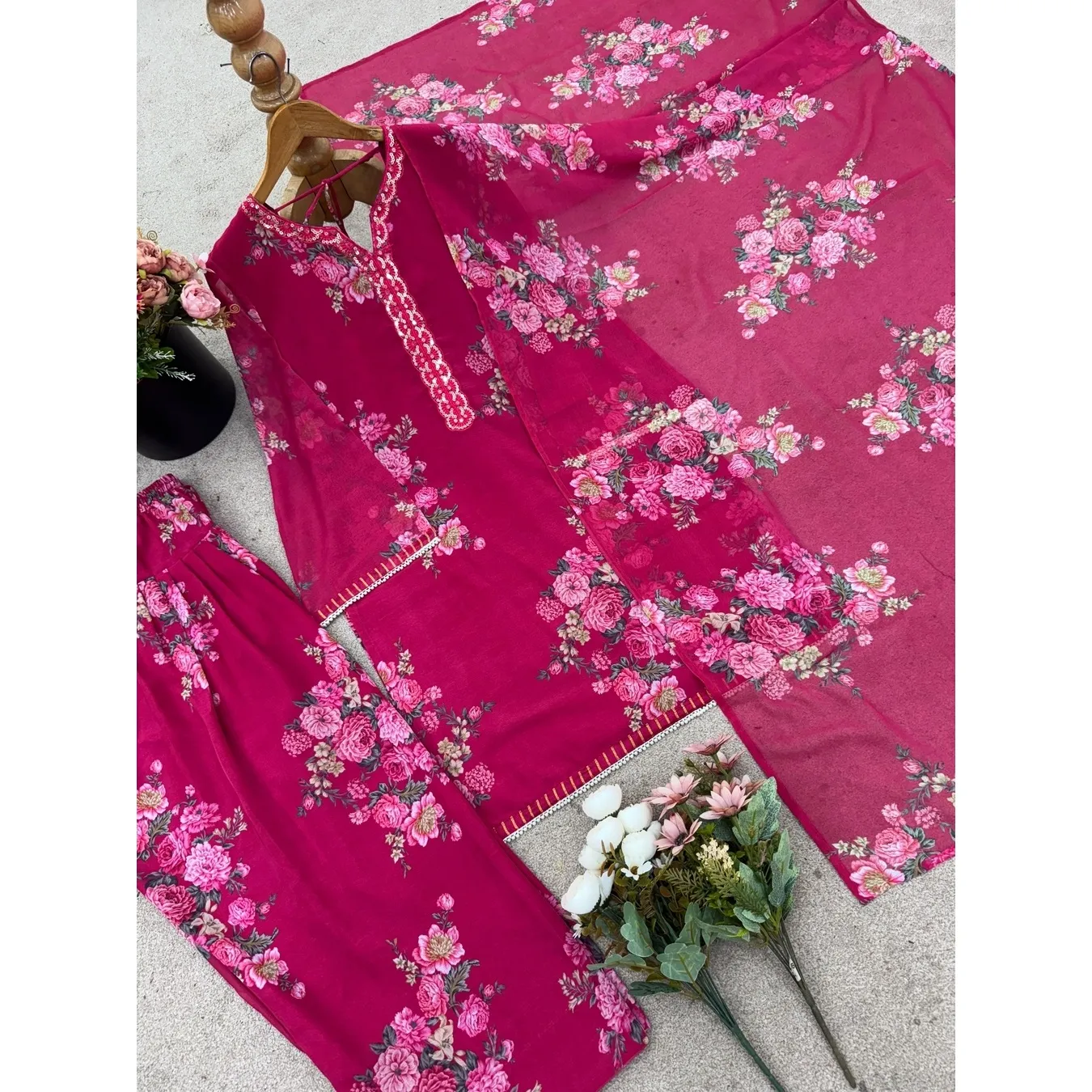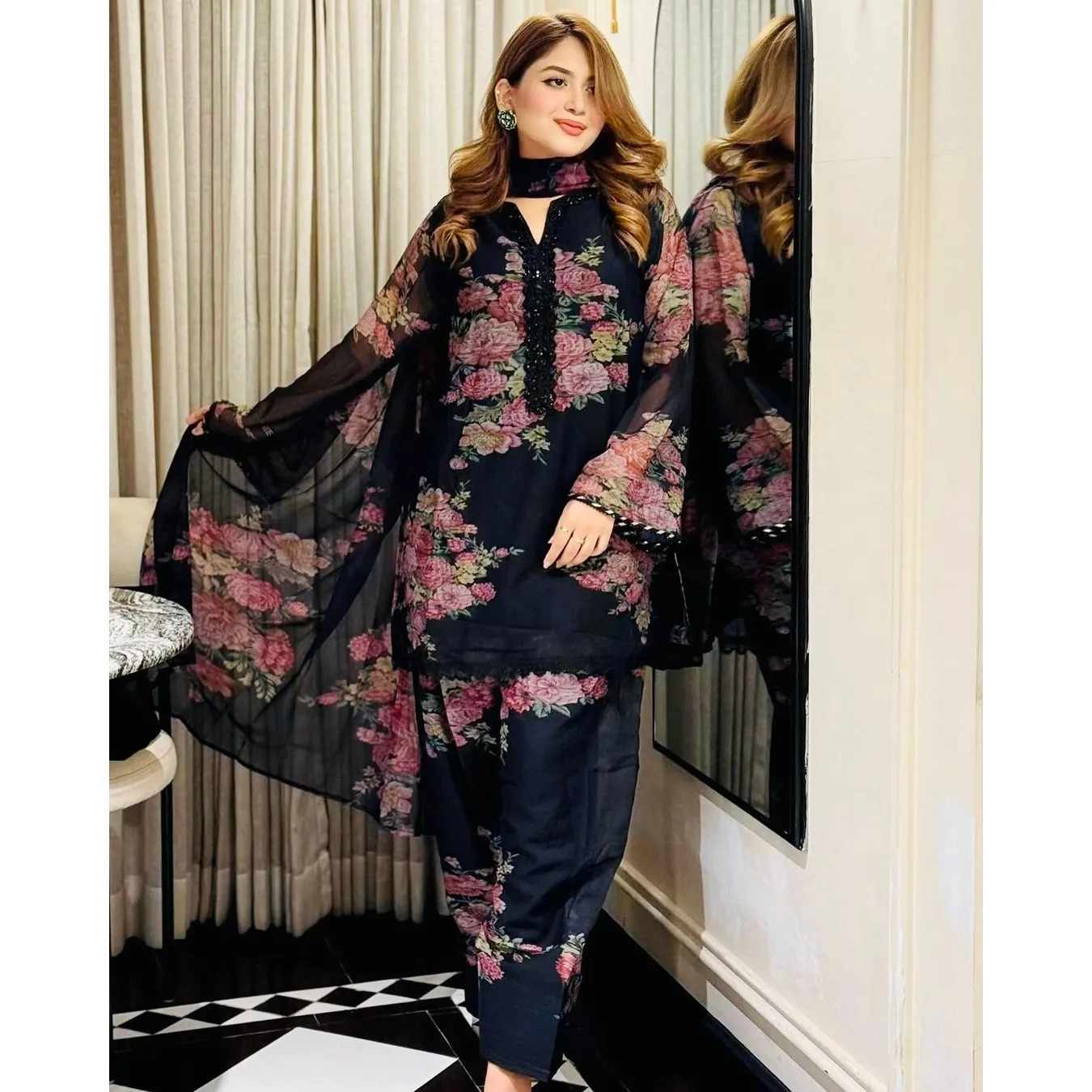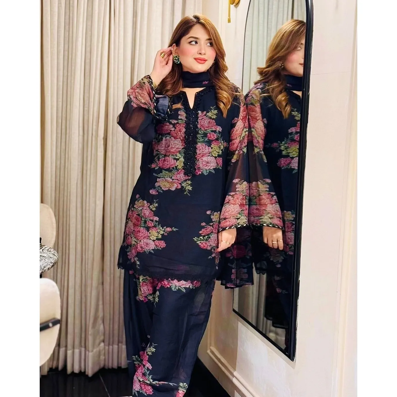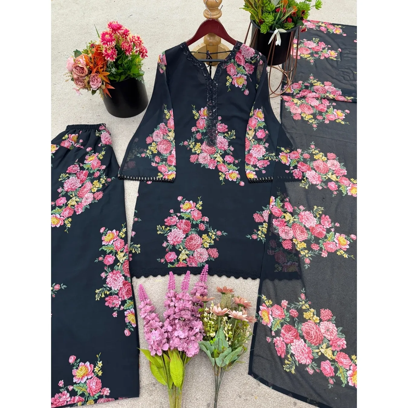| Fabric Description | Top : Pure Faux Georgette With Digital Print With Full Sleeve Top Inner : Heavy Micro Cotton Farshi Pent : Pure Faux Georgette With Elastic (Full Stitched) Dupatta : Pure Faux Georgette With Digital Print |