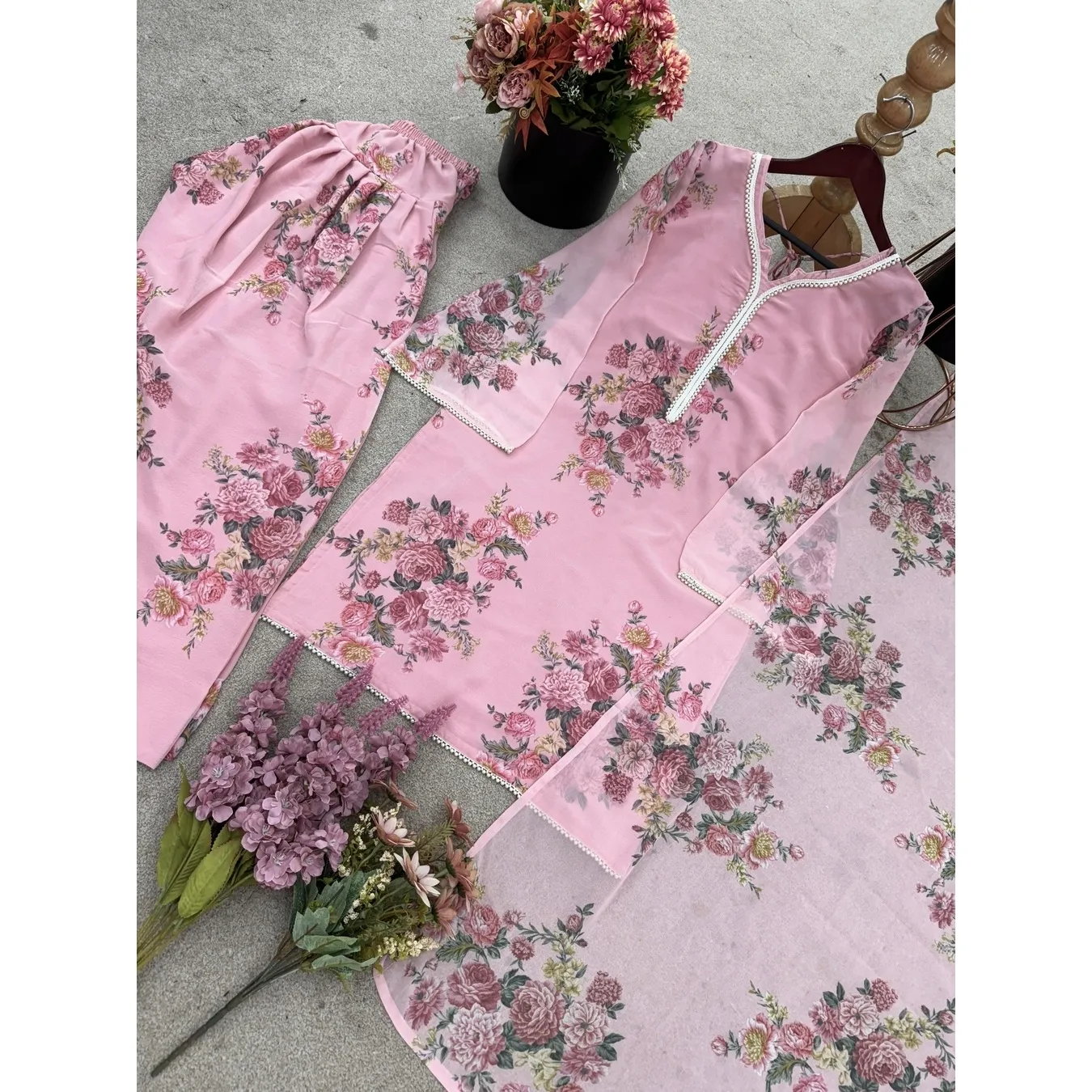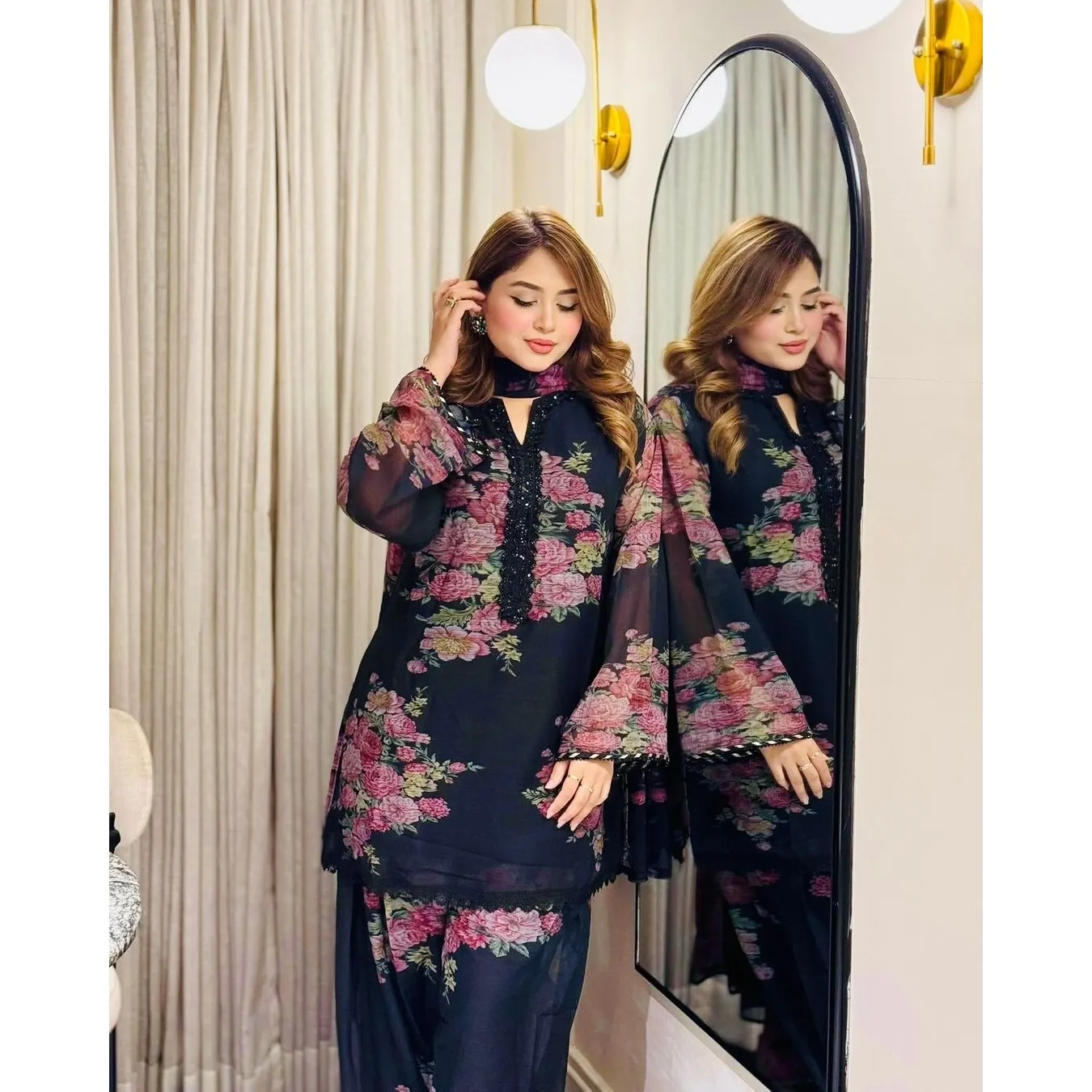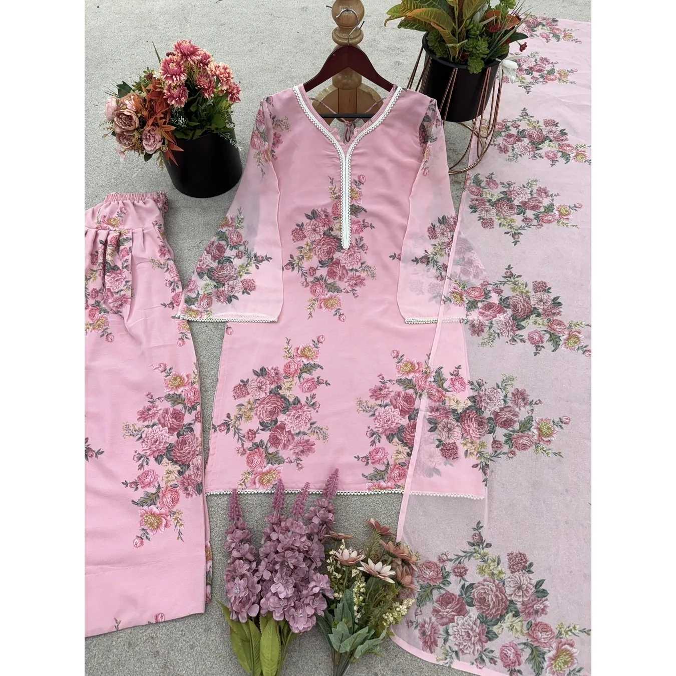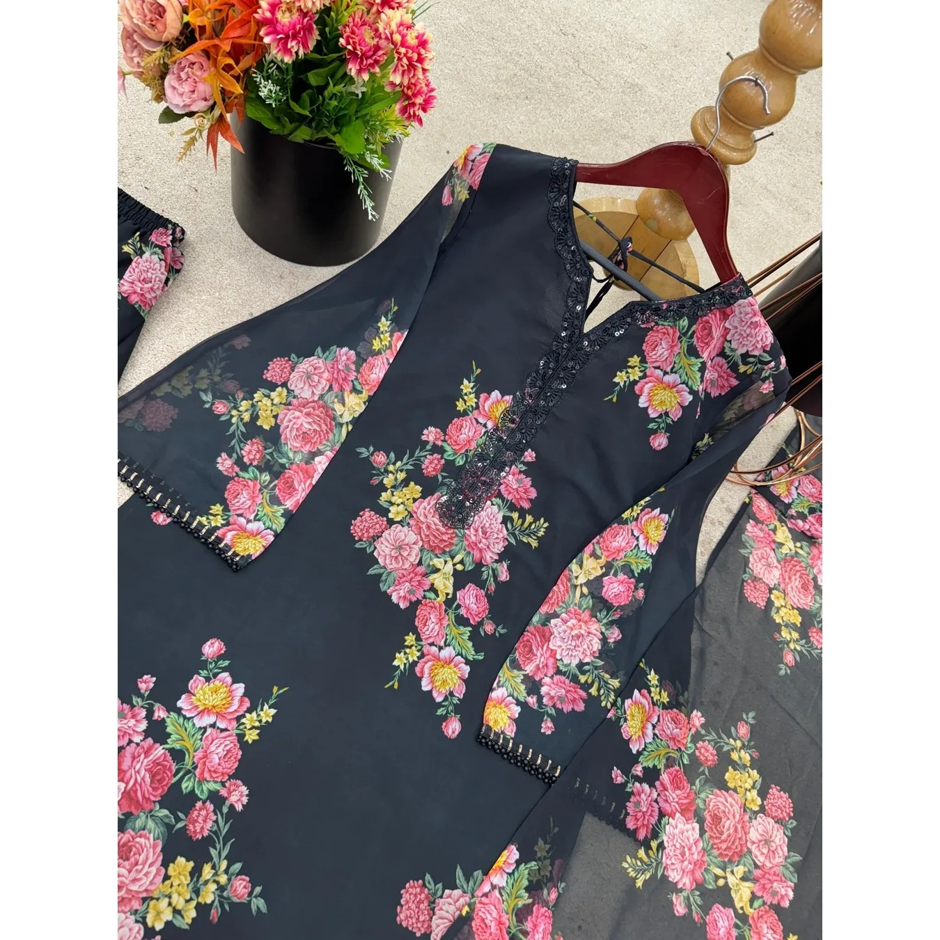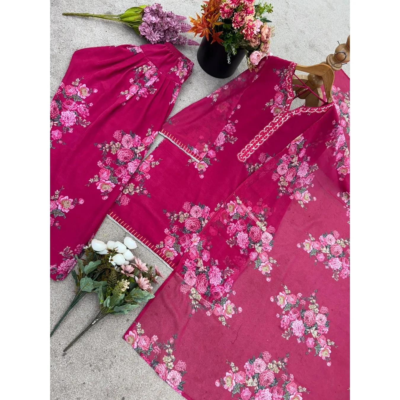 | Fabric Description | Top : Pure Faux Georgette With Digital Print With Full Sleeve Top Inner : Heavy Micro Cotton Farshi Pent : Pure Faux Georgette With Elastic (Full Stitched) Dupatta : Pure Faux Georgette With Digital Print |