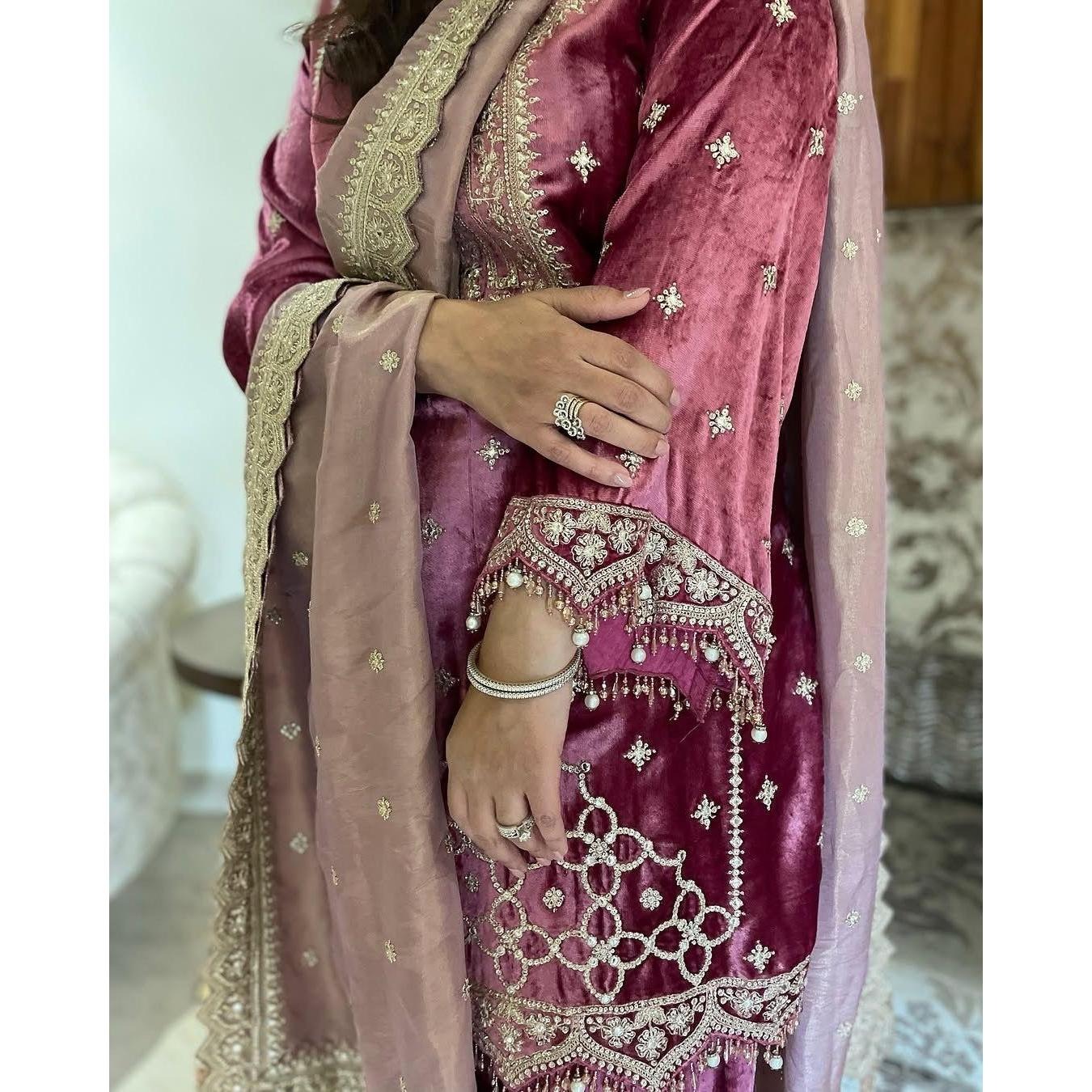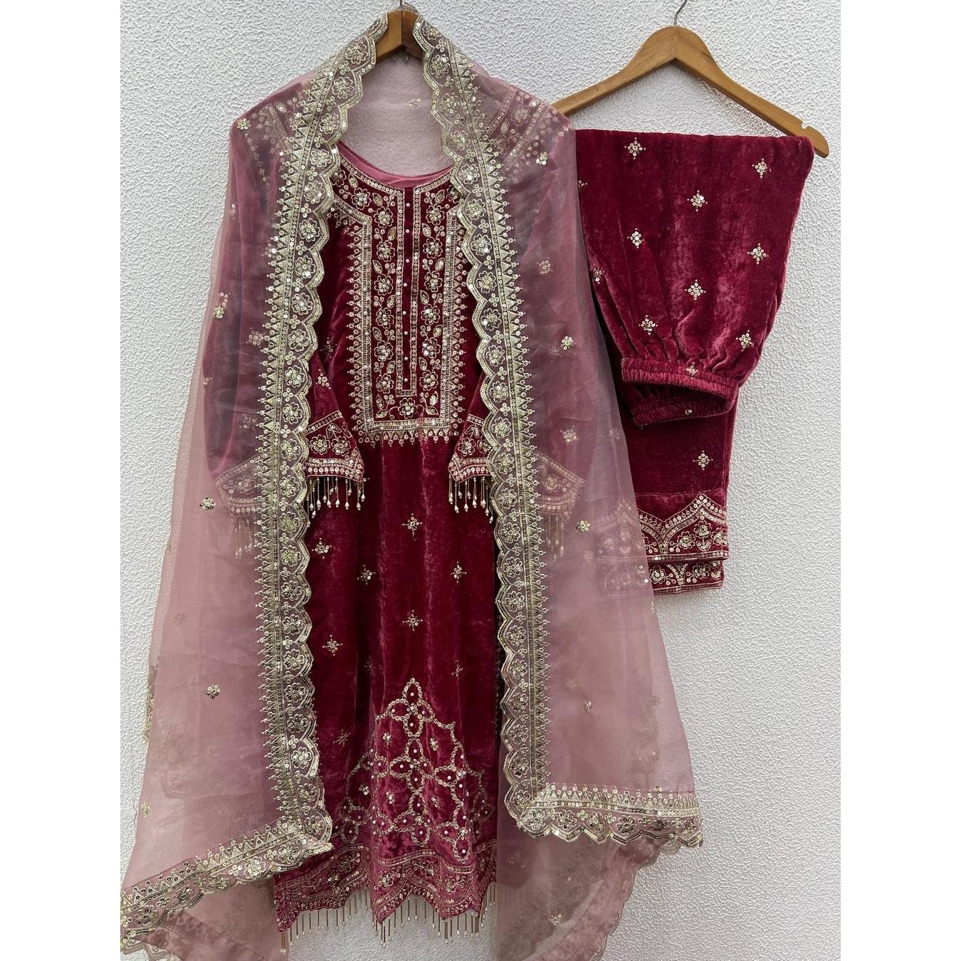| Fabric Description | Top : Pure Heavy Viscose Velvet With Heavy Embroidery Sequence Work Neck Moti Work With Full Sleeves Top Inner : Micro Cotton Bottom : Viscose Velvet ( Full Stiched) With Elastic Dupatta : Tebby Orgenza With Heavy Embroidery Sequence Work Lace border |