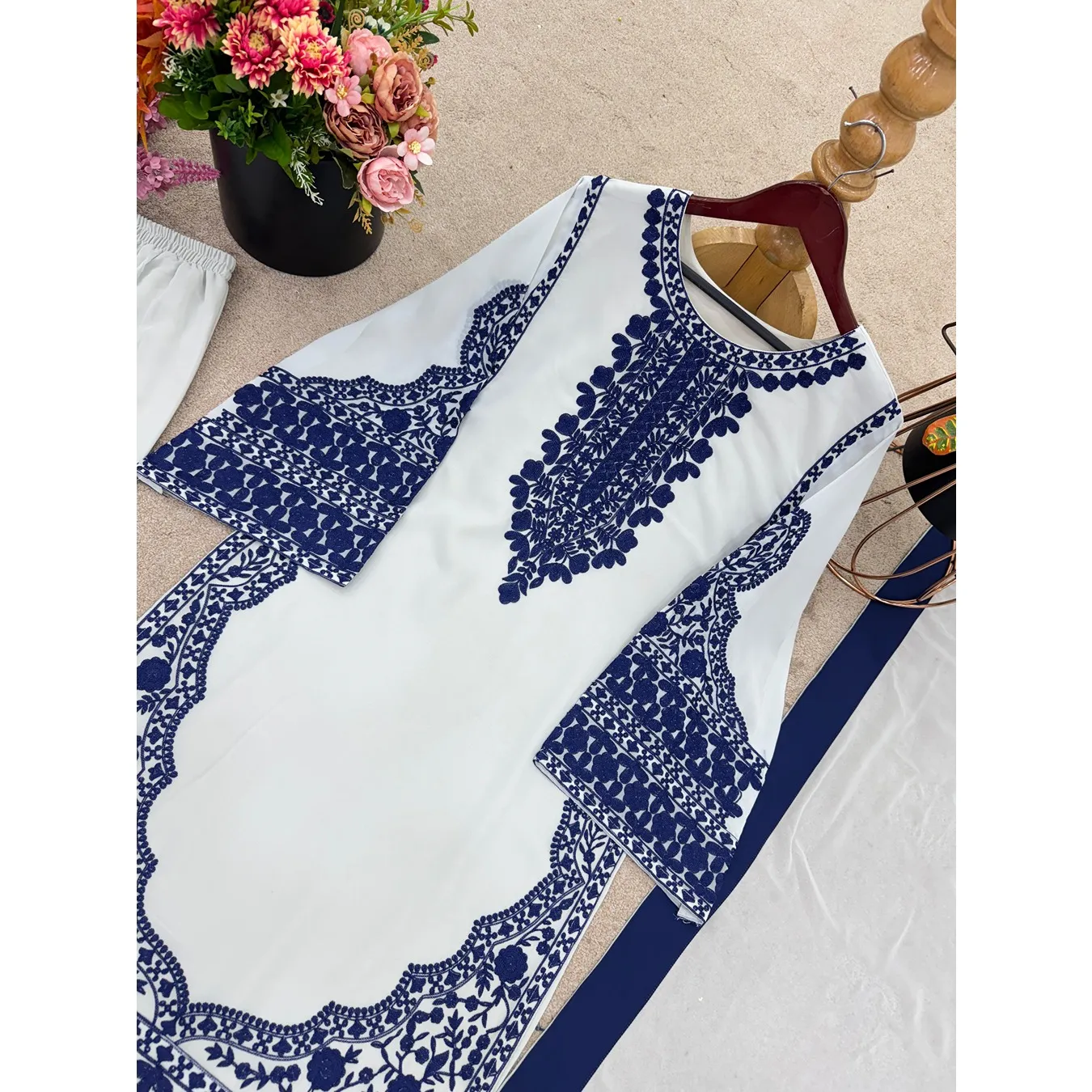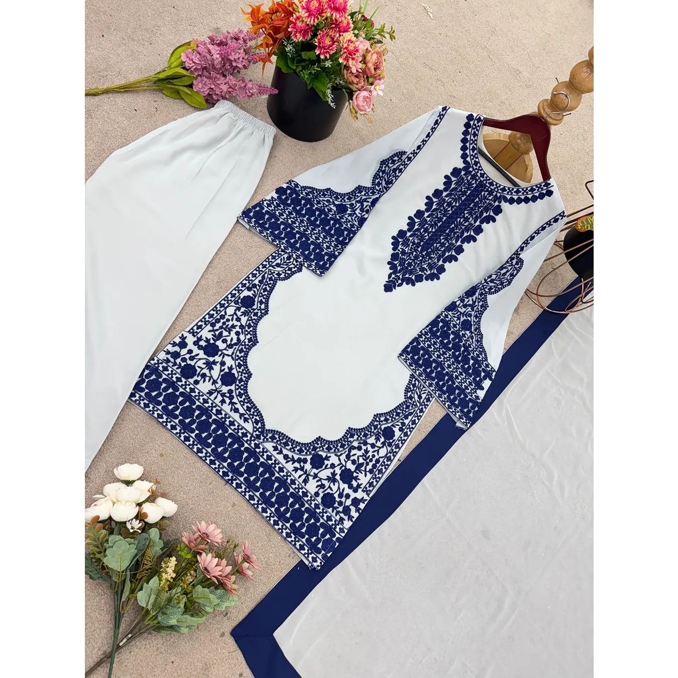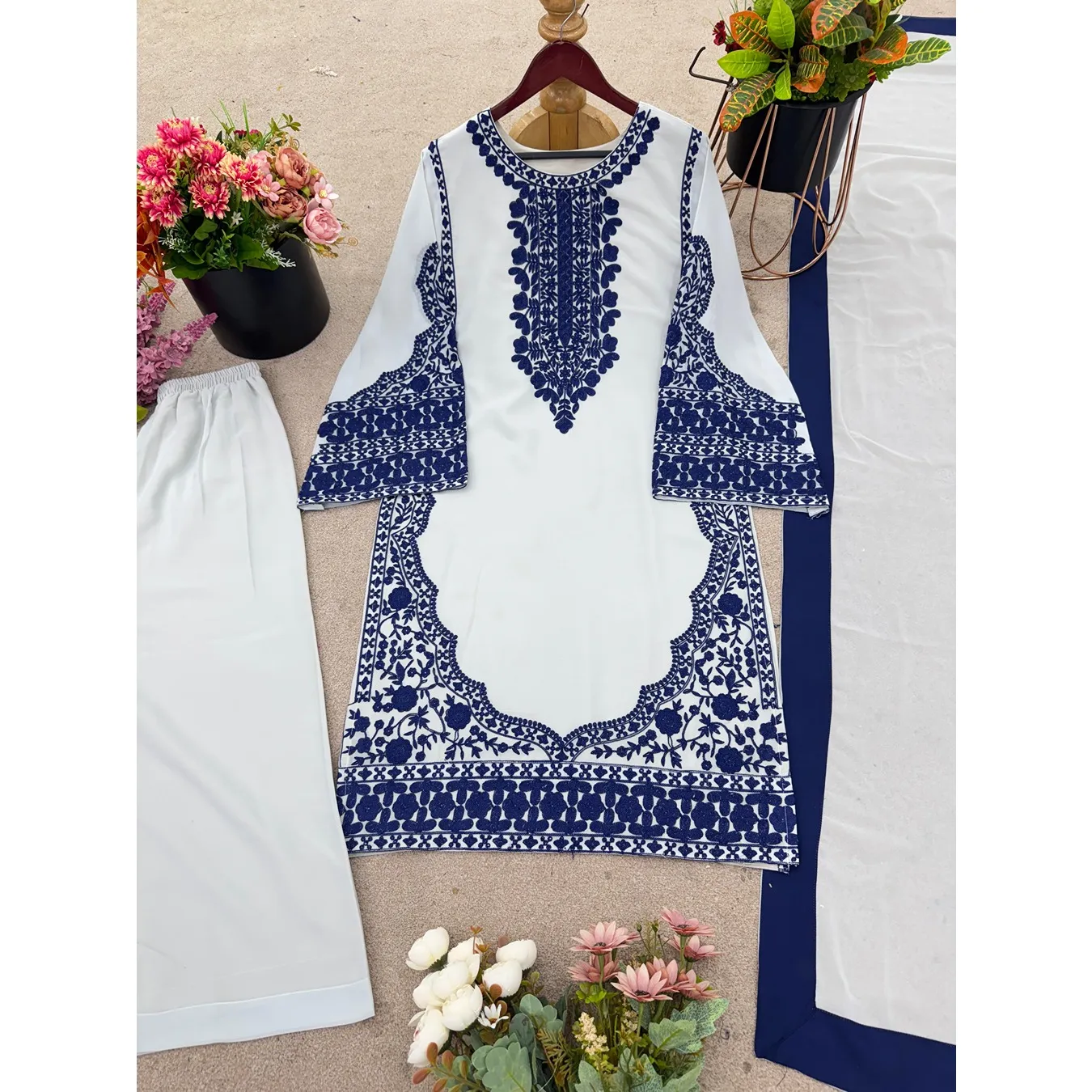 | Fabric Description | Top : Fox Georgette With Embroidery Work Sleeves : Full Inner : Heavy Micro Cotton Bottom (Plazzo) : Fox Georgette Dupatta : Faux Georgette |