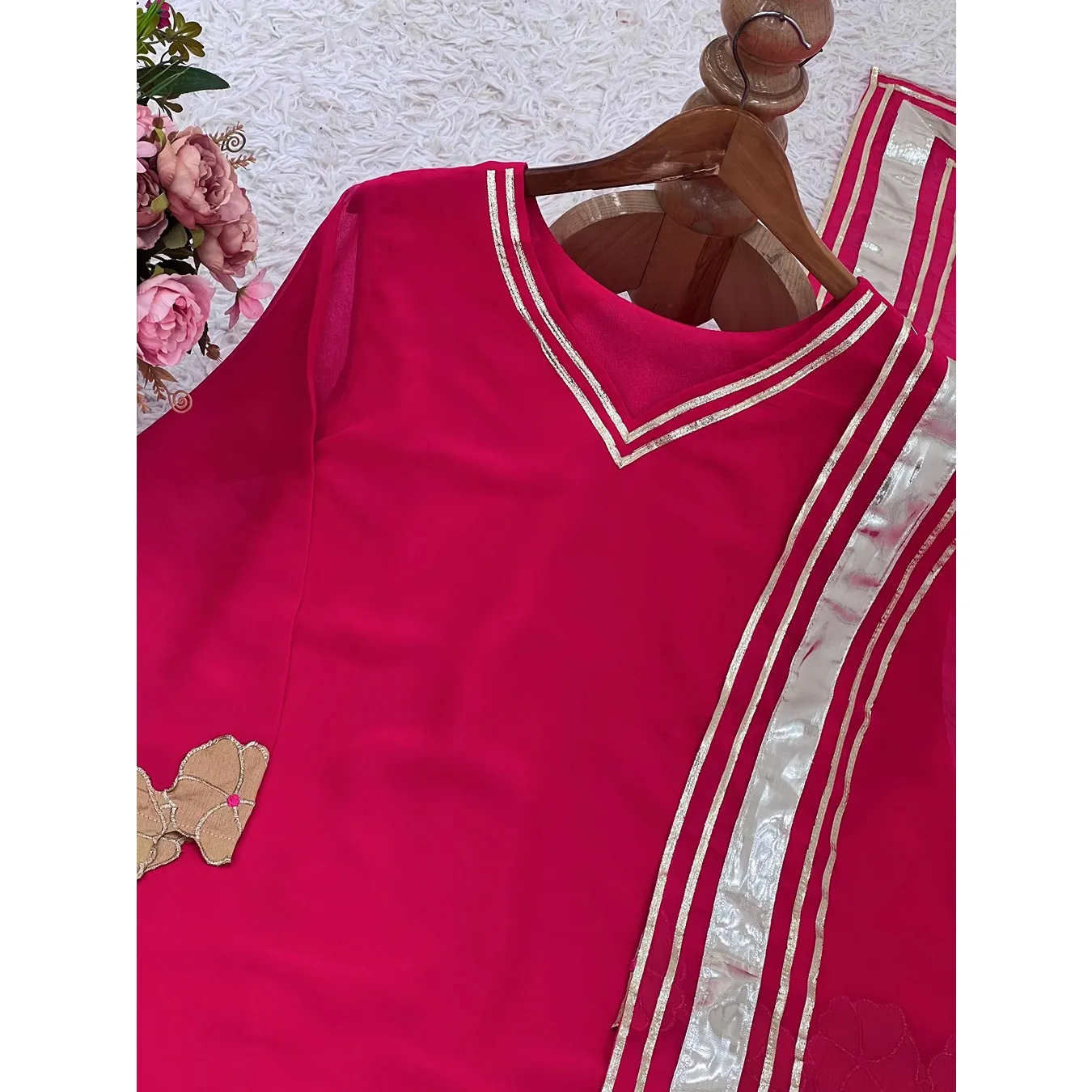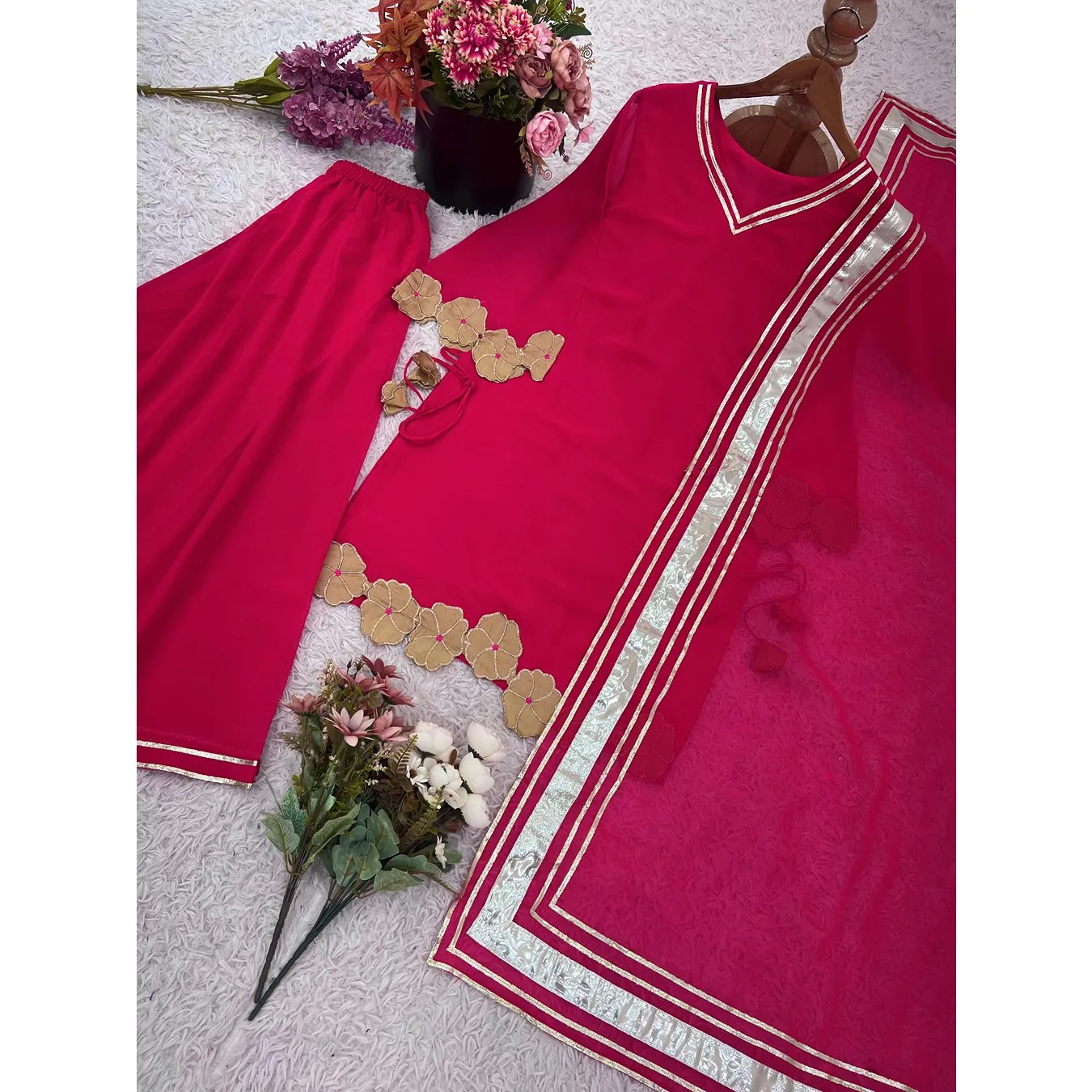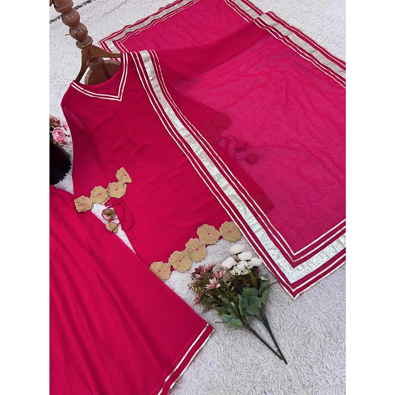| Fabric Description | Top : Fox Georgette With Embroidery Work Sleeves : Full Inner : Heavy Micro Cotton Bottom Sharara Plazzo : Fox Georgette, Full Flair Dupatta : Faux Georgette Design : Gotta Patti With Border |