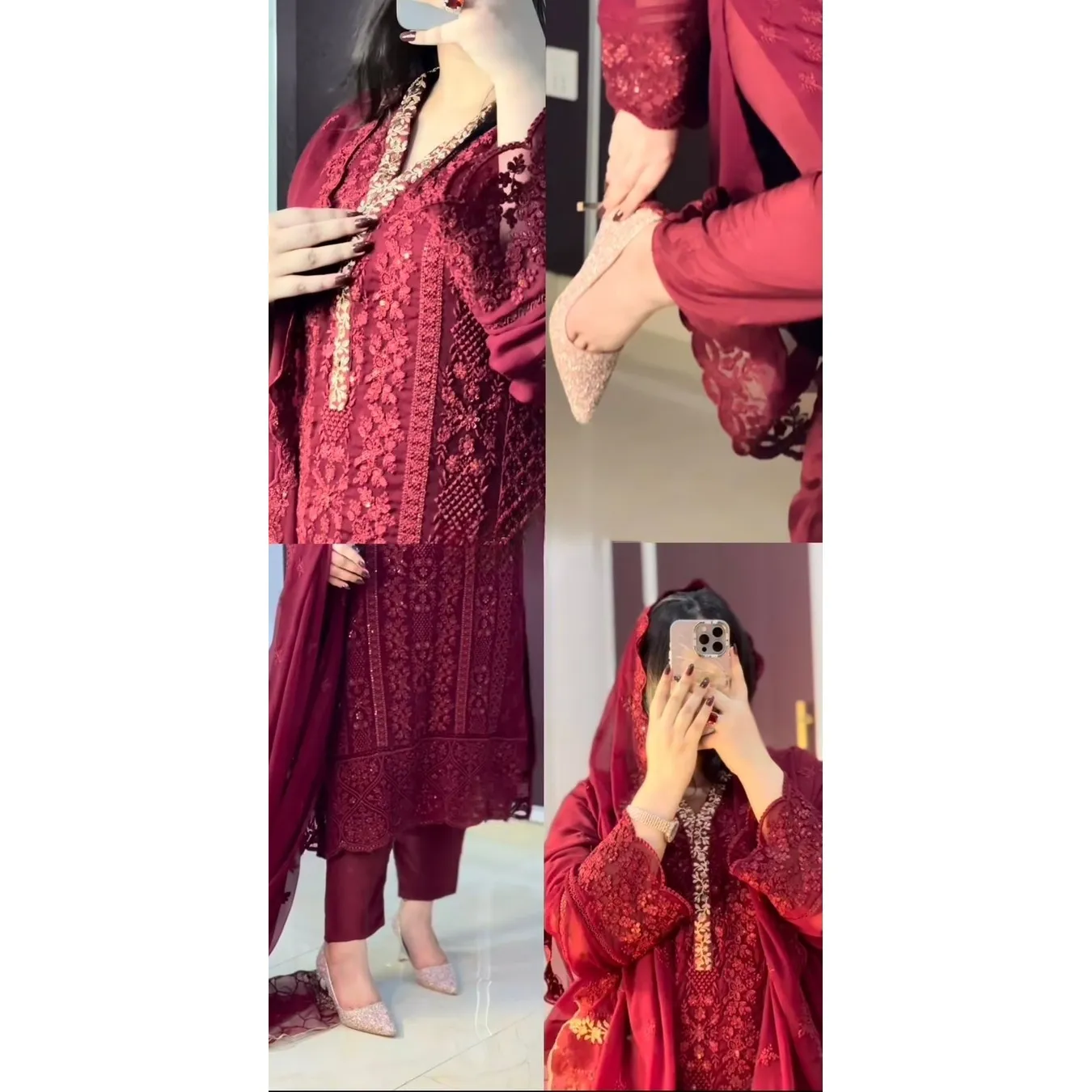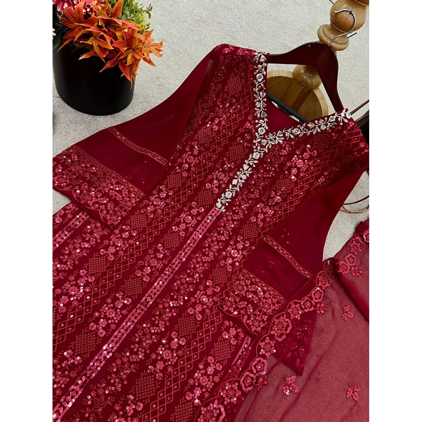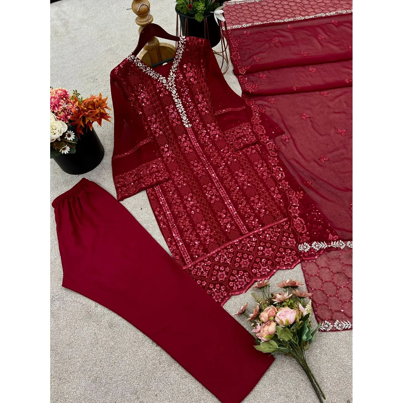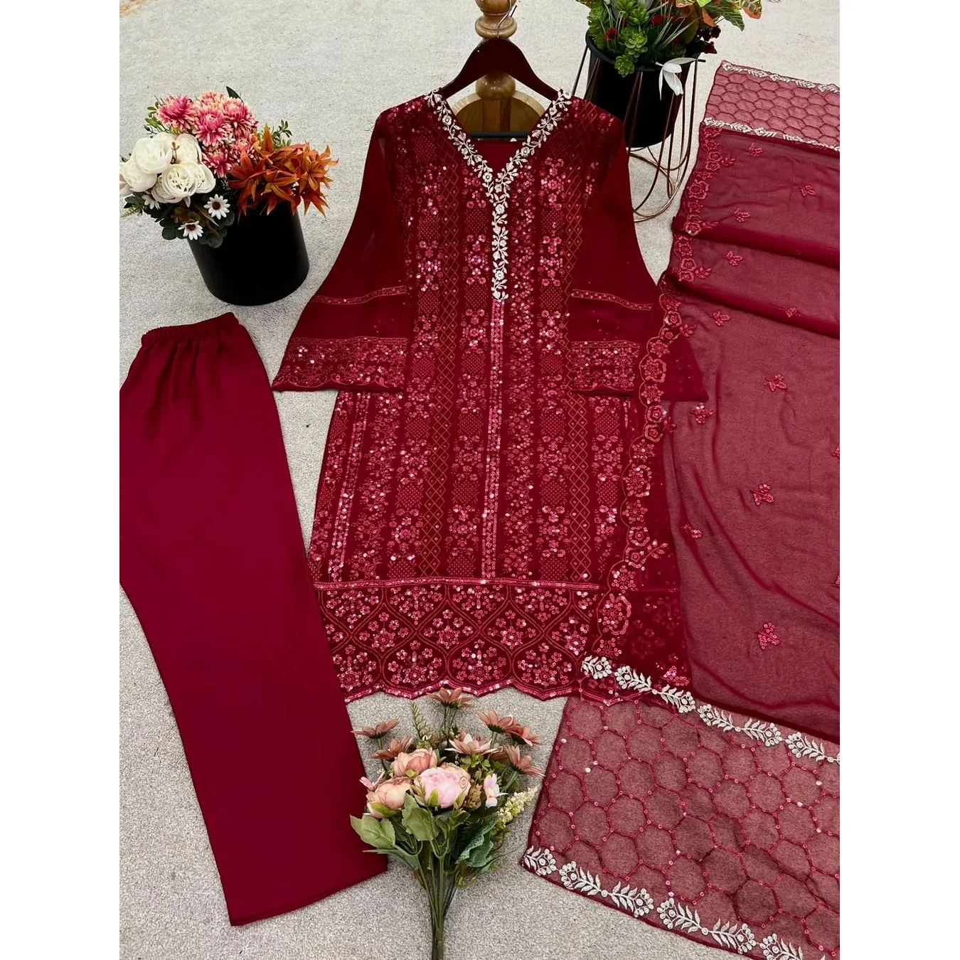 | Fabric Description | Top : Pure Faux Georgette With Embroidery Sequence Work With Kimono Fency Sleeve Top Inner : Heavy Micro Cotton Pent : Heavy Micro Cotton With Elastic (Full Stitched) Dupatta : Pure Faux Georgette With Embroidery Sequence Work |