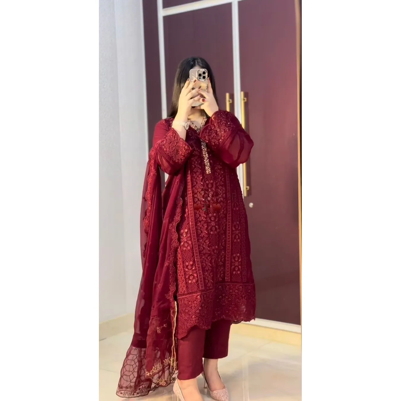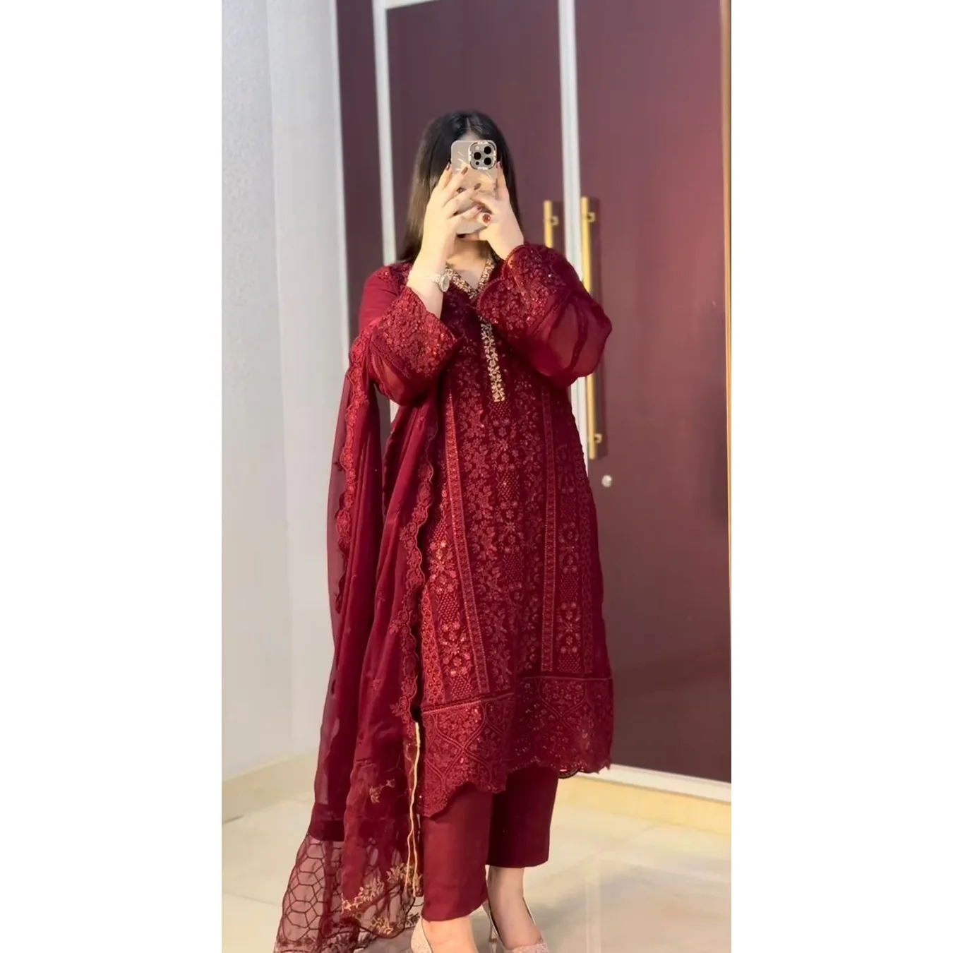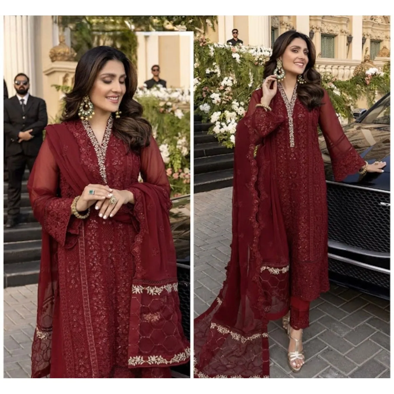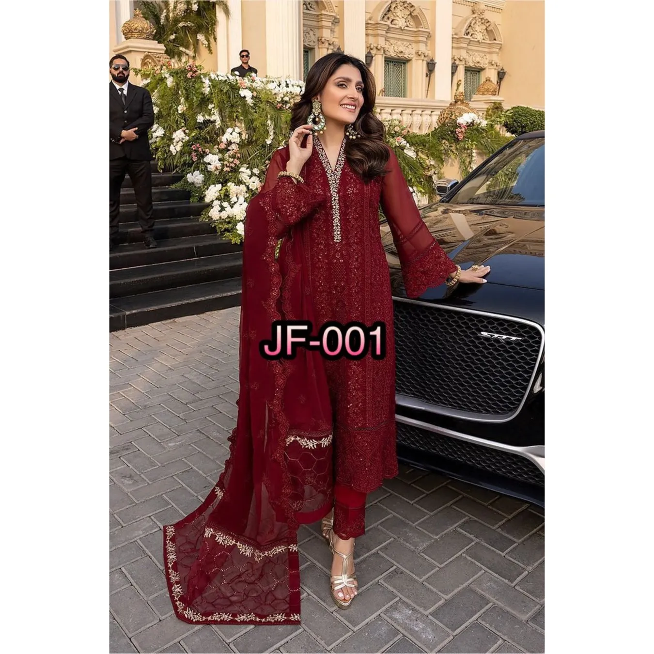 | Fabric Description | Top : Pure Faux Georgette With Embroidery Sequence Work With Kimono Fency Sleeve Top Inner : Heavy Micro Cotton Pent : Heavy Micro Cotton With Elastic (Full Stitched) Dupatta : Pure Faux Georgette With Embroidery Sequence Work |