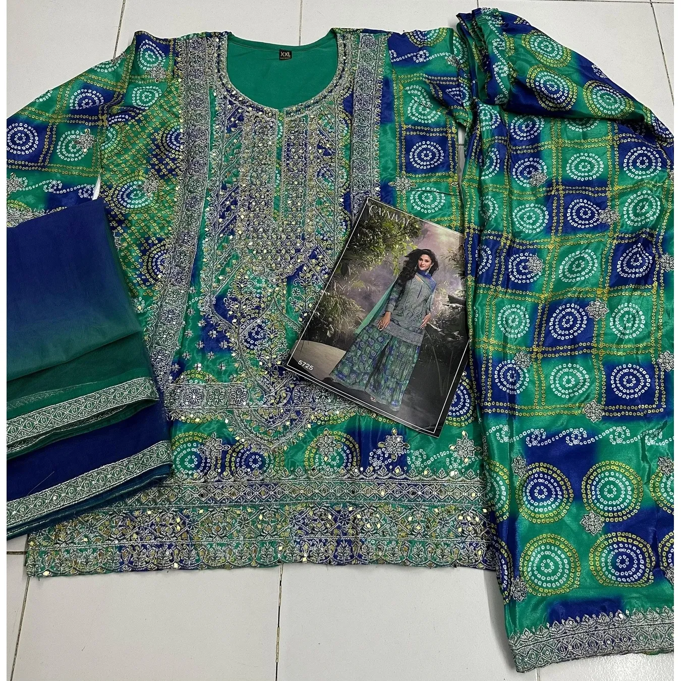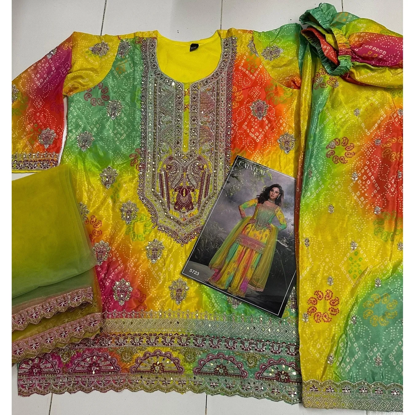 | Fabric Description | Top : Heavy Chinon With Multi Digital Print With Sequence Embroidery Stich Work Sleeves : Heavy Premium Chinon With Print & Work Inner : Heavy Crep Silk Bottom : Heavy Chinon With Print and Work Dupatta :- Heavy Net |