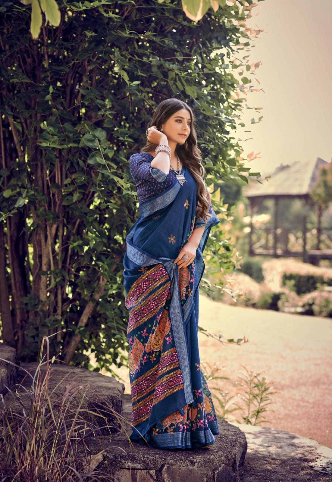| Fabric Description | LINEN || LINEN PRINT & AMP; ZARI WOVEN BORDER WITH FLORAL PRINT PALLU BY COTTON BUNDAS WITH RUNNING BLOUSE |