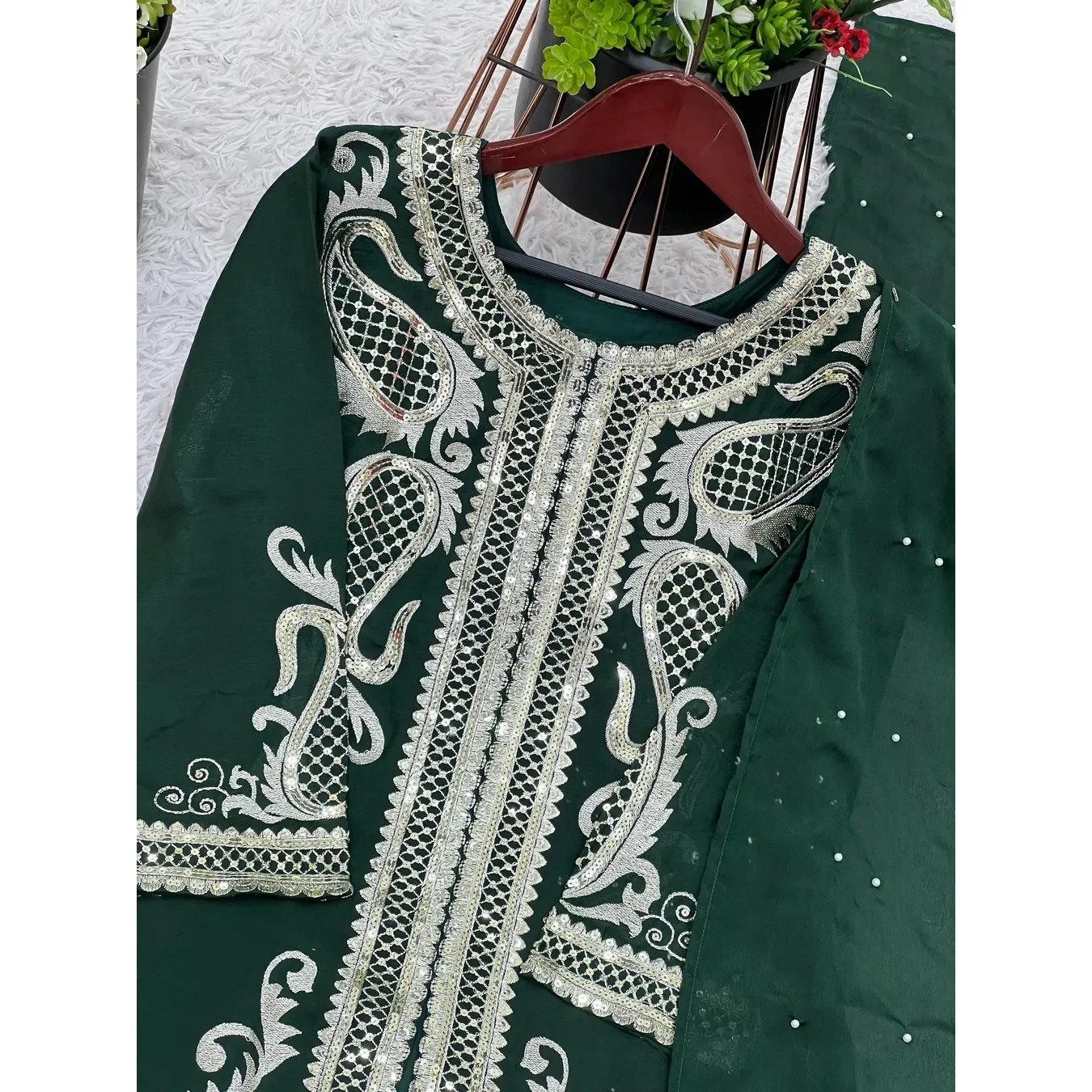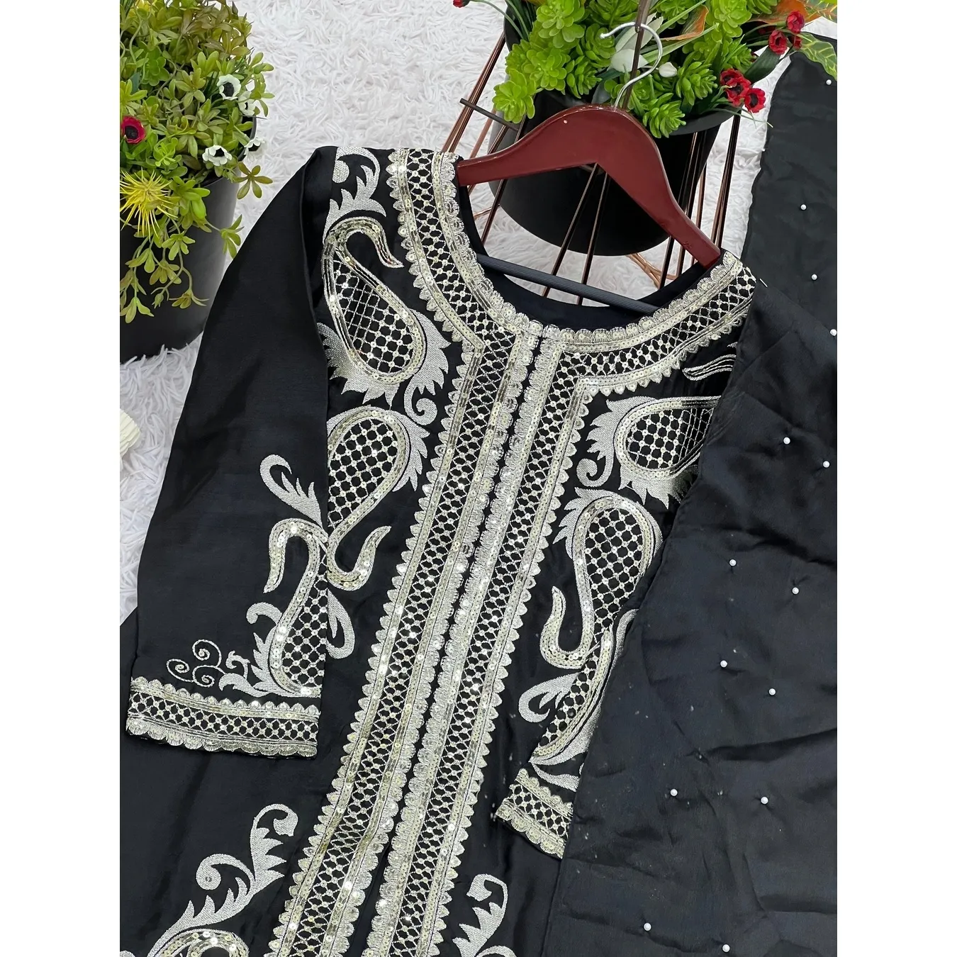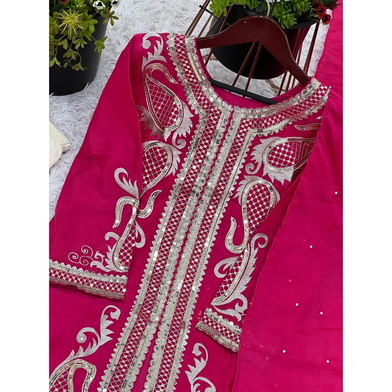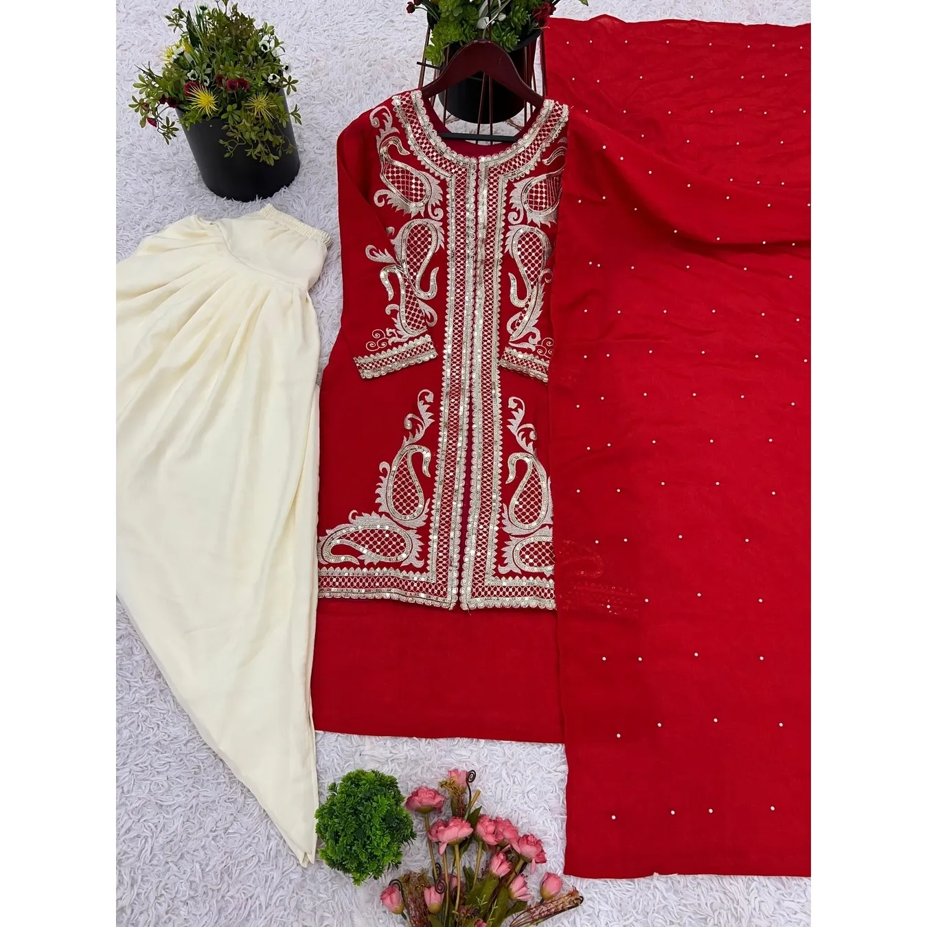Fabric Description | Top : Heavy Chinon Silk With Embroidery Sequence Work Inner : Micro Cotton Dhoti Salwar : Heavy Faux Georgette With Embroidery Sequence Work Inner : Micro Cotton Dupatta : Heavy Chinon Silk With Rivet Moti |