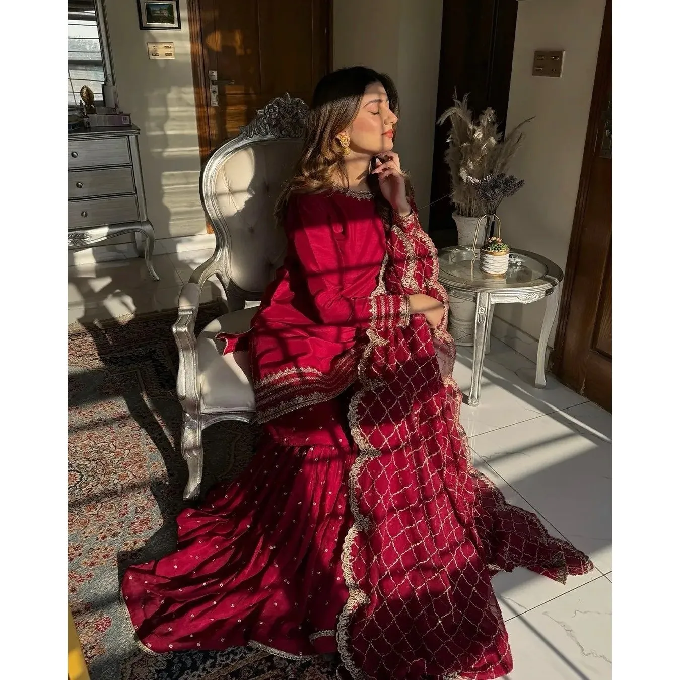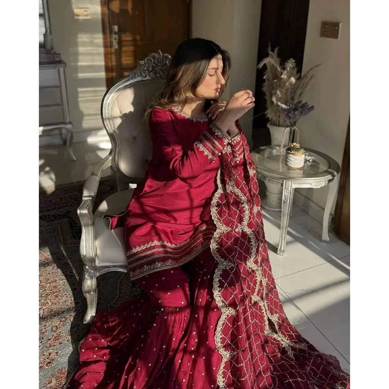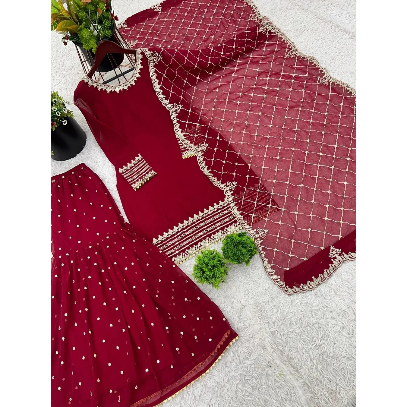 Fabric Description | Top : Heavy Faux Georgette With 5mm Embroidery Sequence Work With Full Sleeve Top Inner : Heavy Micro Cotton Gharara : Heavy Faux Georgette With 5mm Embroidery Sequence Work Pent inner : Heavy Micro Cotton Dupatta : Heavy Faux Georgette With 5mm Embroidery Sequence Work |
