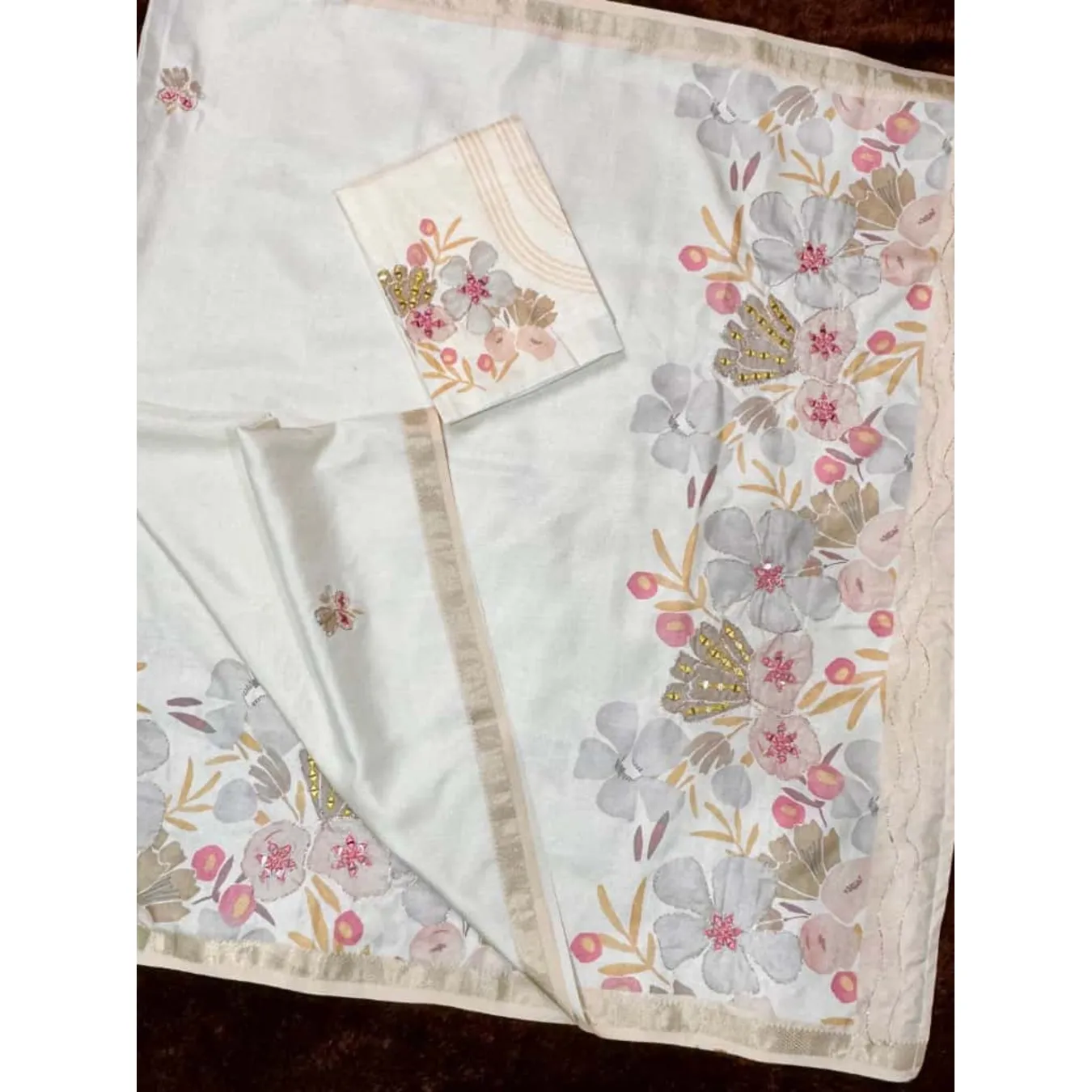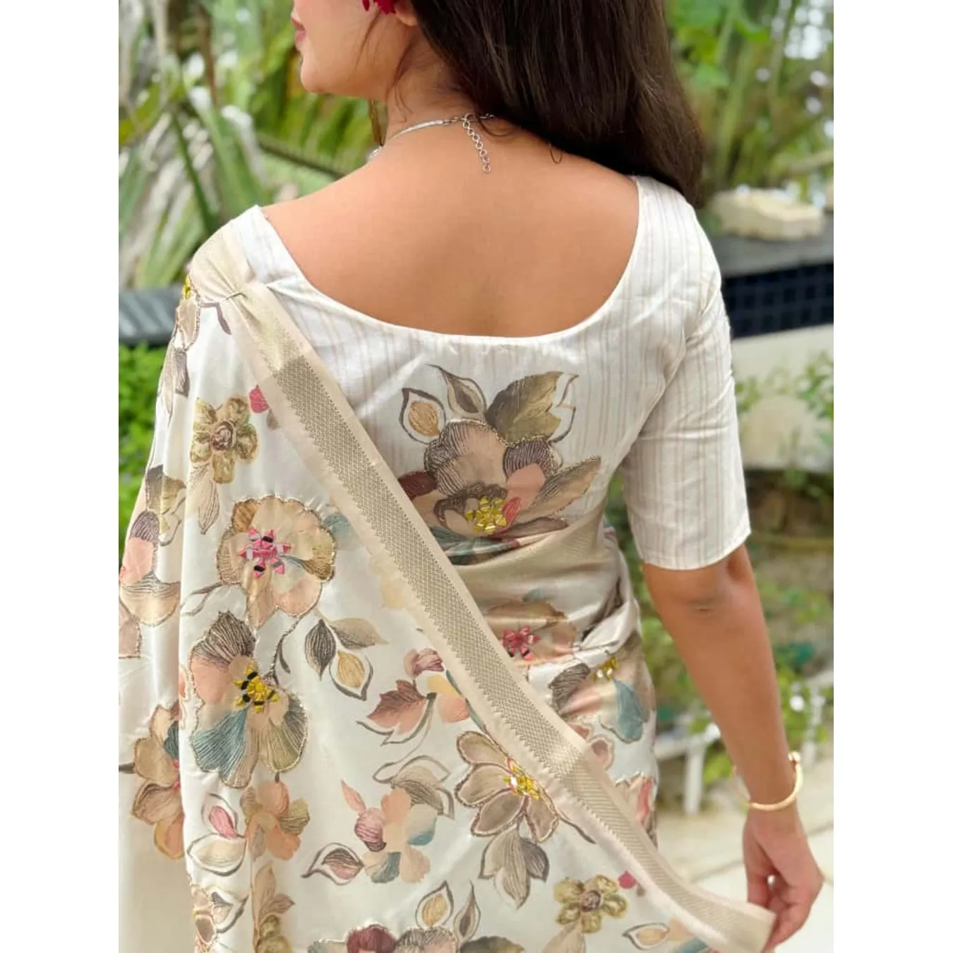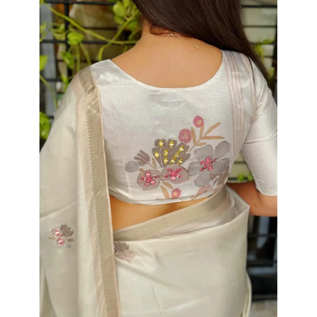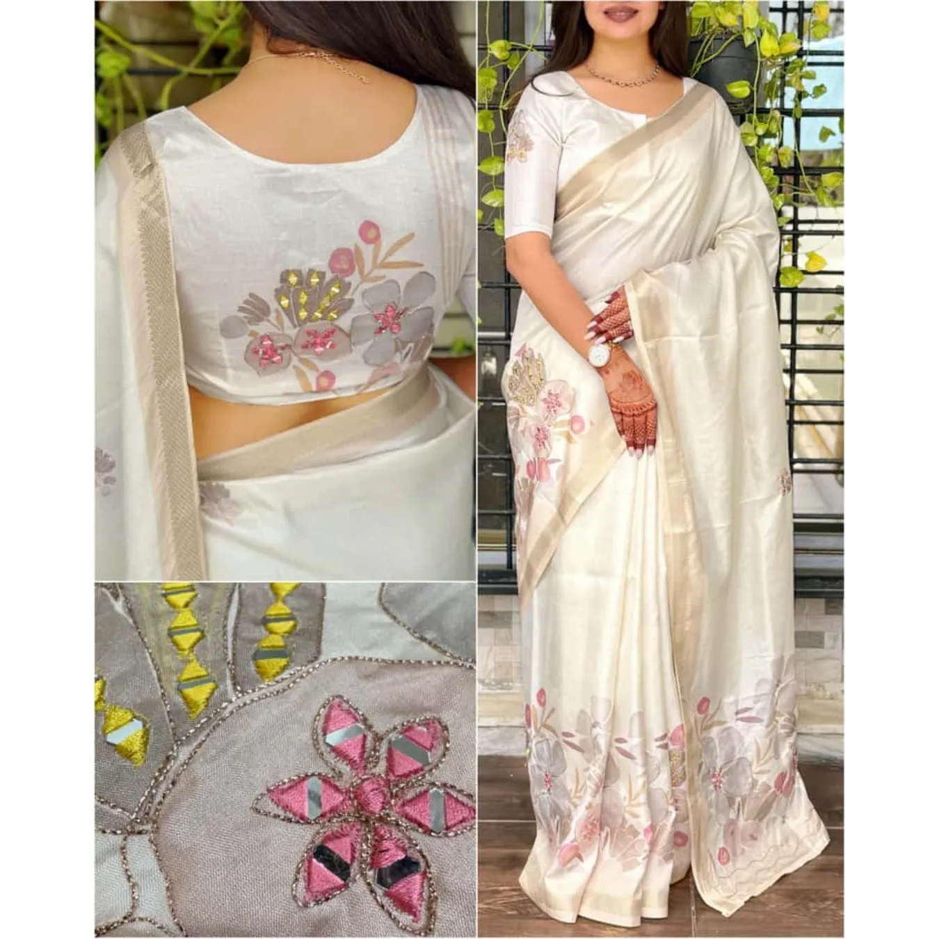 | Fabric Description | Saree : Tusser Cotton Blouse : Tusser Cotton Pattern : 1 : Digital Print In Full Saree 2 : Original Hand Mirror Kali Mundi Work In Full Saree With Thread Position Work 3 : Zari Jacquard Weaving Border 4 : Position Mirror Work With Digital Print In Blouse |