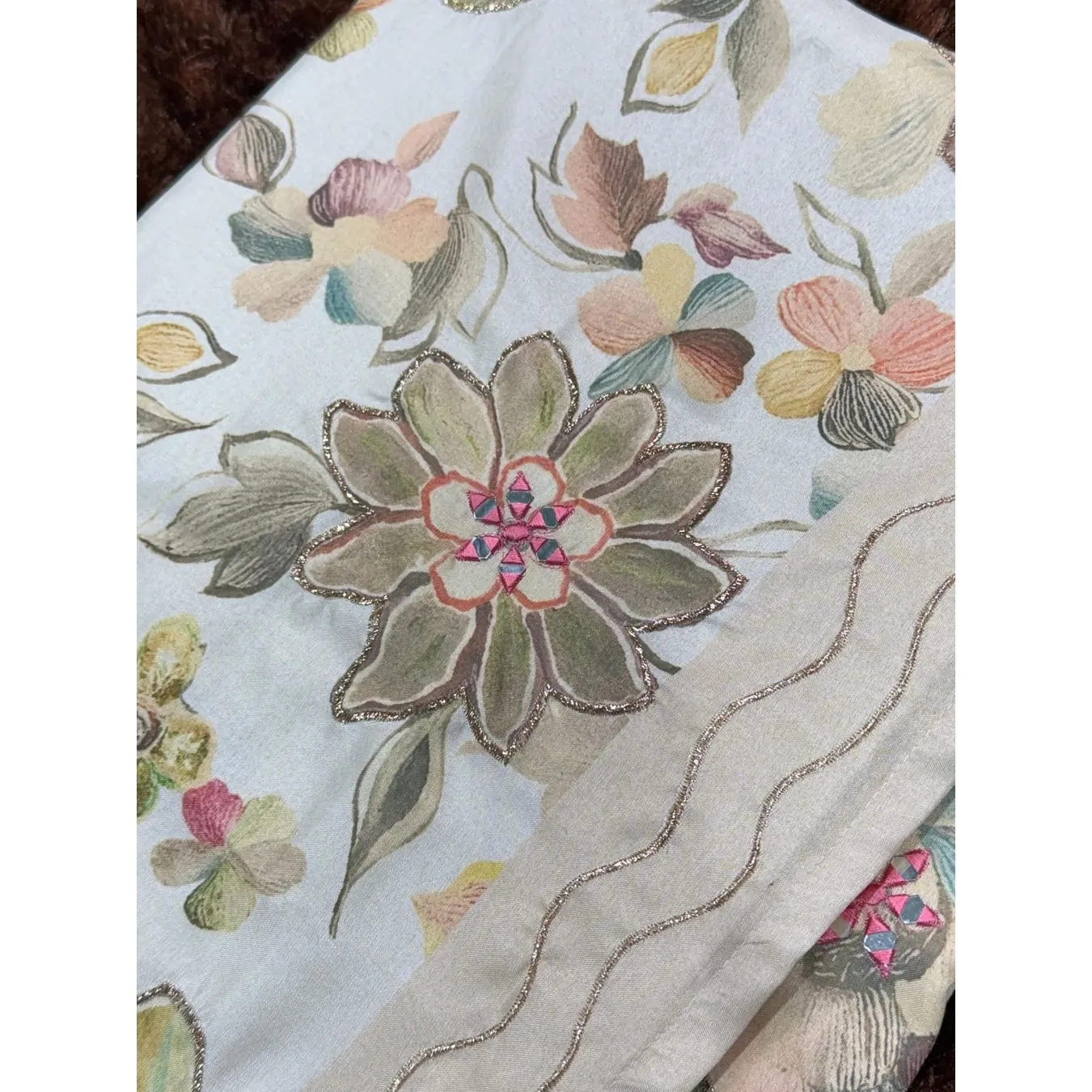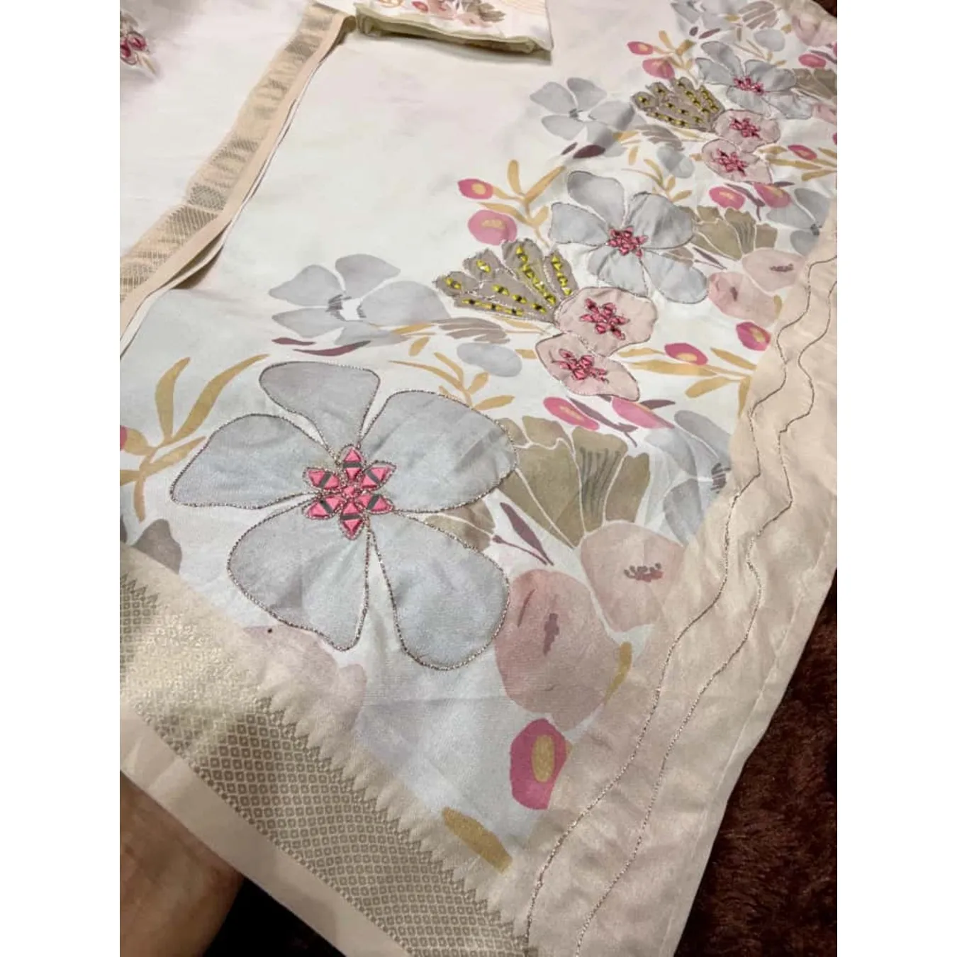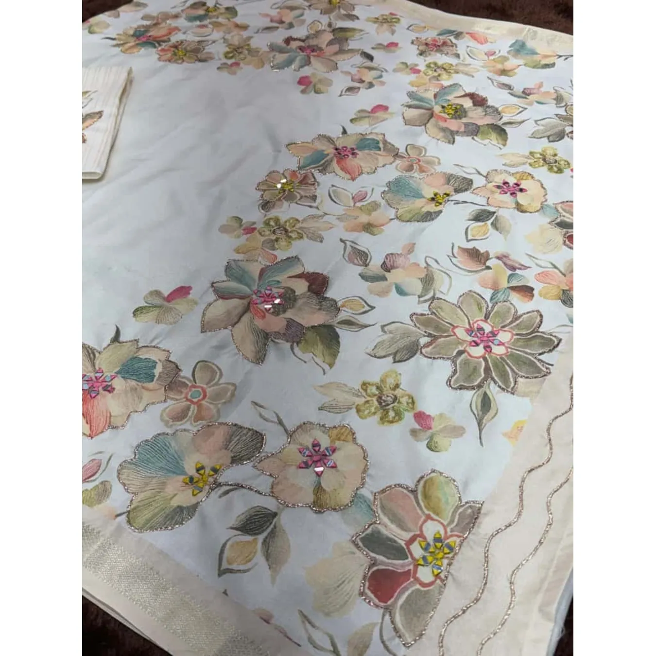 A Designer Tusser Colored Printed Beauty For Your Wardrobe With Unique Hand Mirror Work