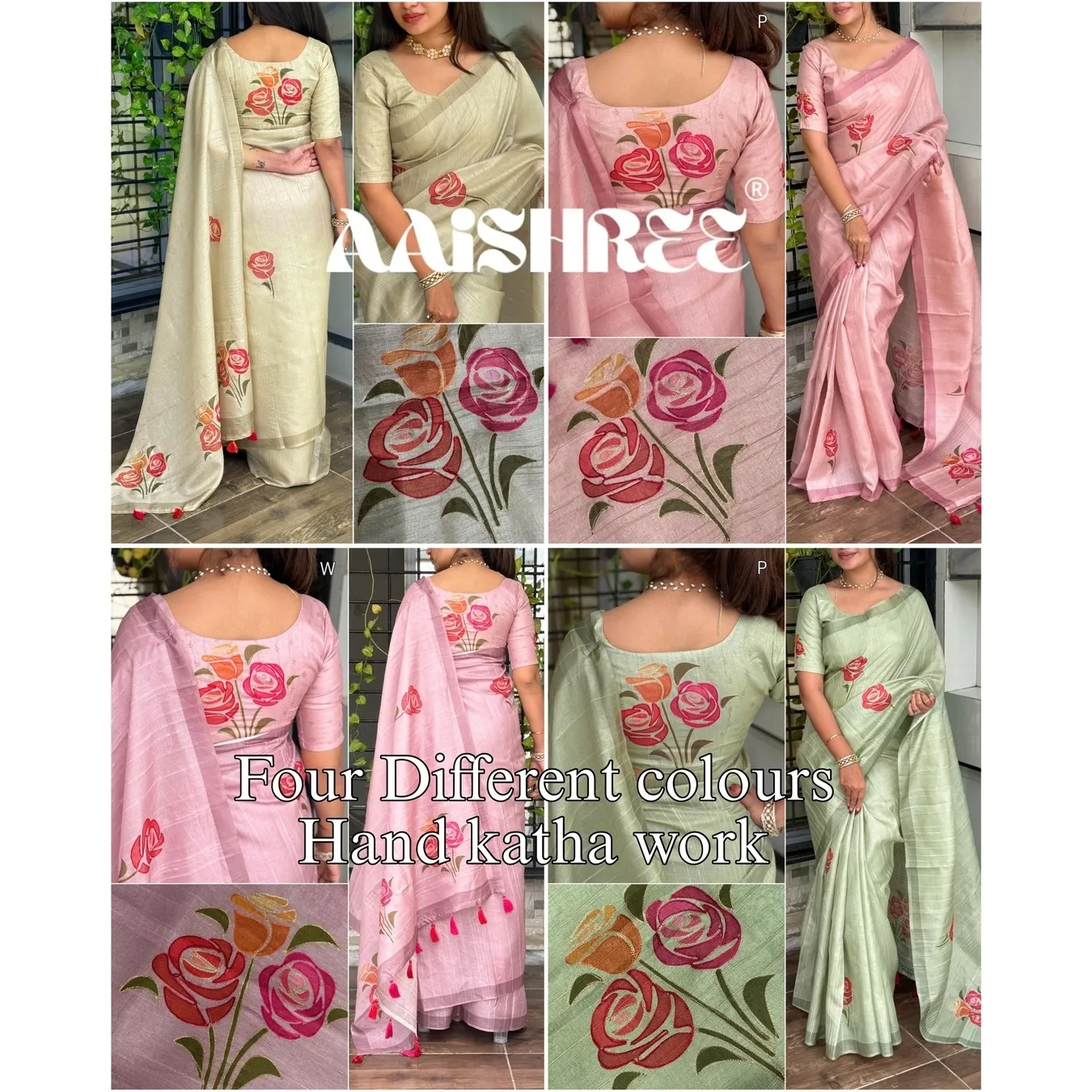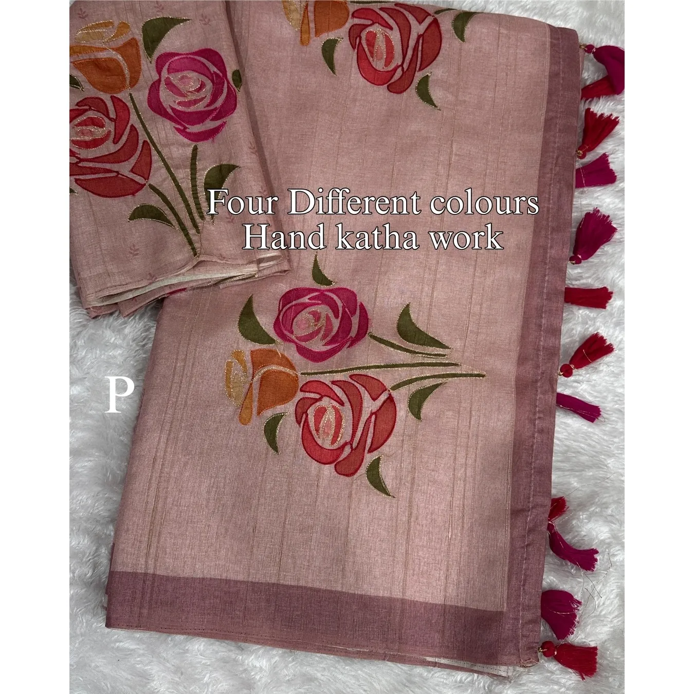 | Fabric Description | Saree : Linen Cotton Blouse : Linen Cotton Pattern :- 1 : Thread Hand Position Khatha Work In Saree 2 : Multi Color Hand Brush Print Effect In Saree 3 : Hand Position Khatha Work In Blouse 4 : Fancy Tussles In Saree Pallu |
