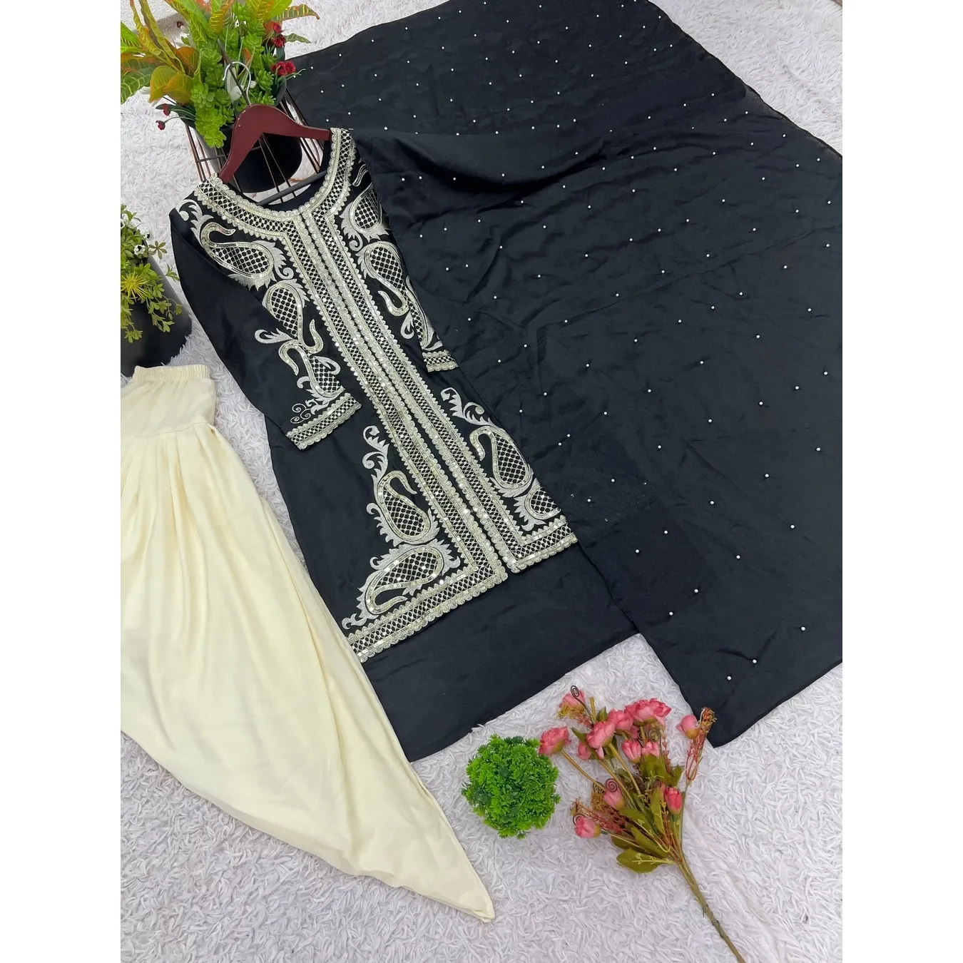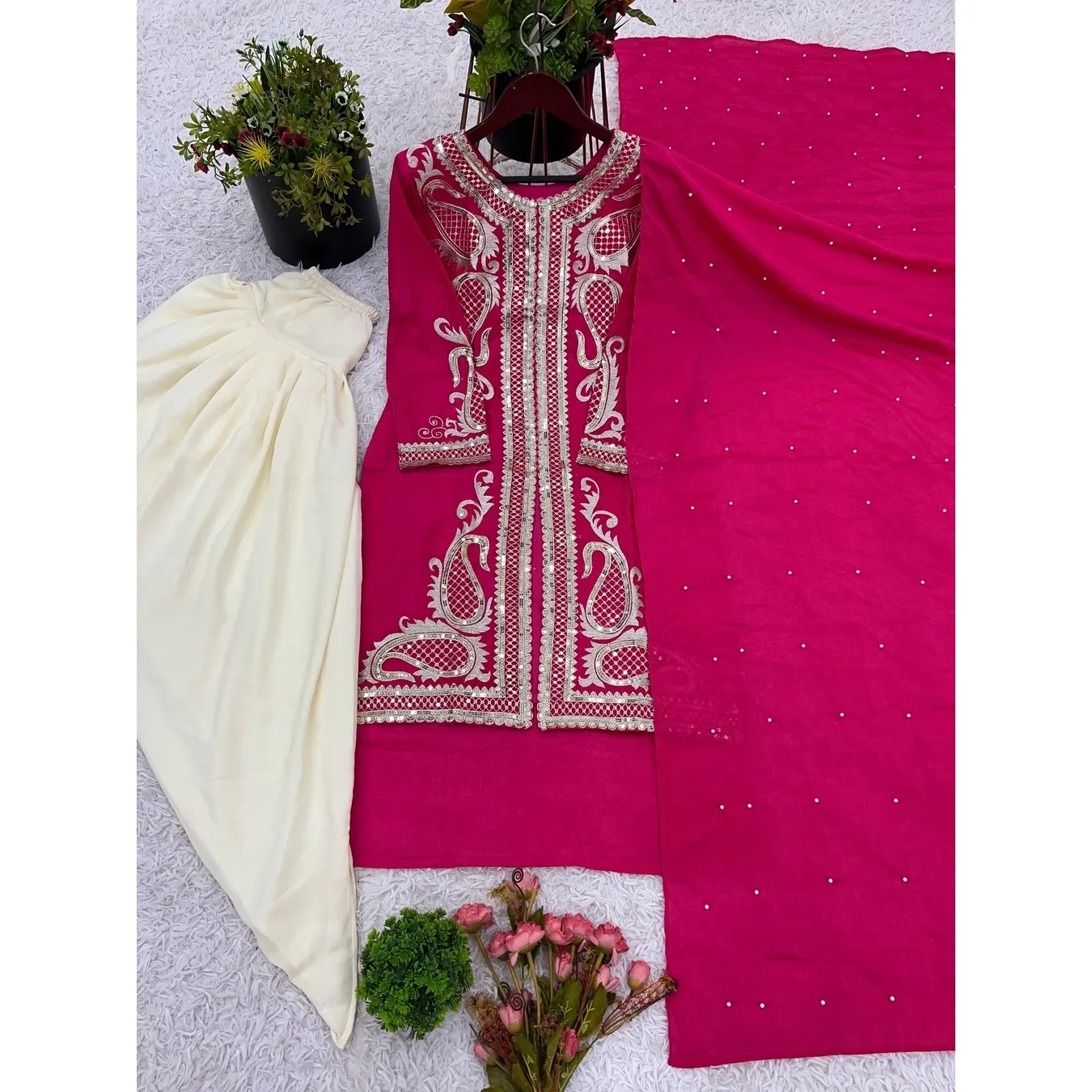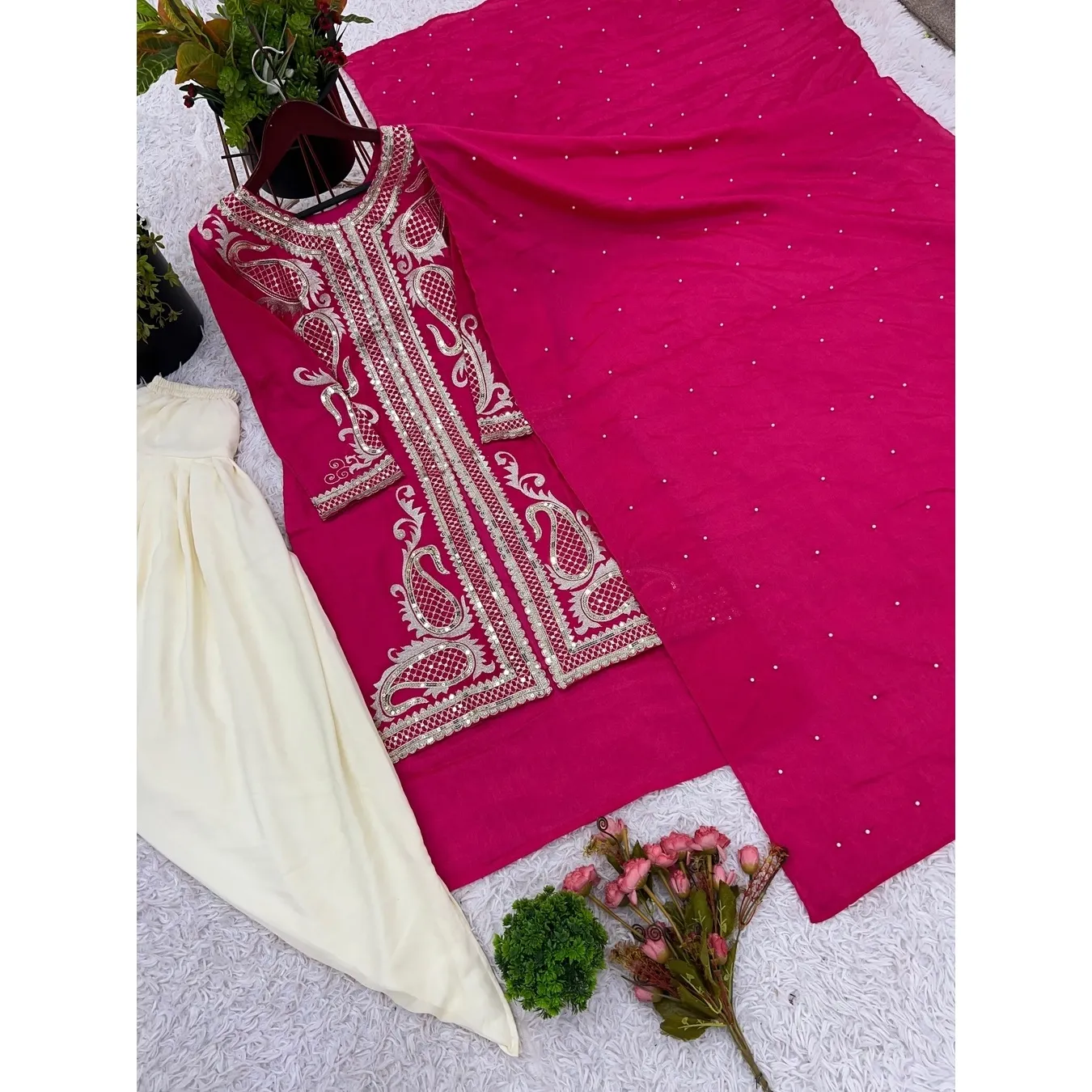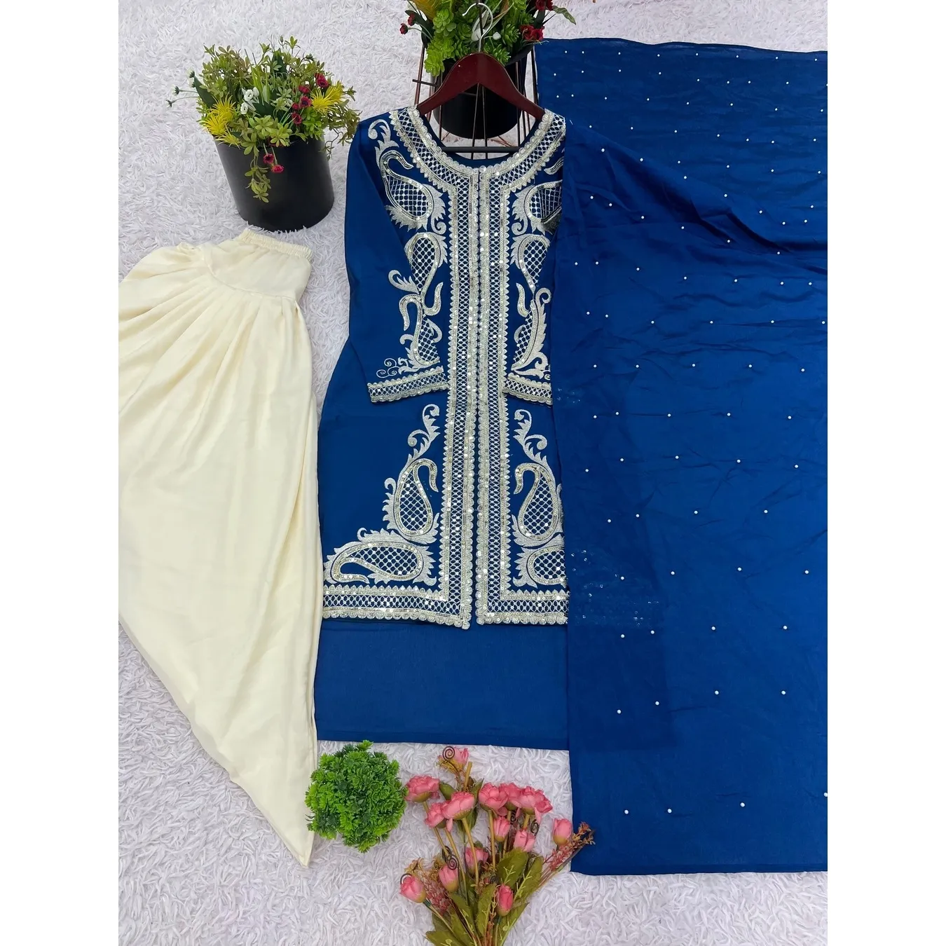 Fabric Description | Top : Heavy Chinon Silk With Embroidery Sequence Work Inner : Micro Cotton Dhoti Salwar : Heavy Faux Georgette With Embroidery Sequence Work Inner : Micro Cotton Dupatta : Heavy Chinon Silk With Rivet Moti |