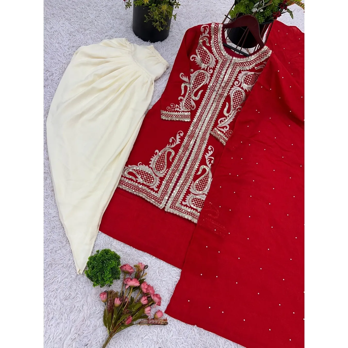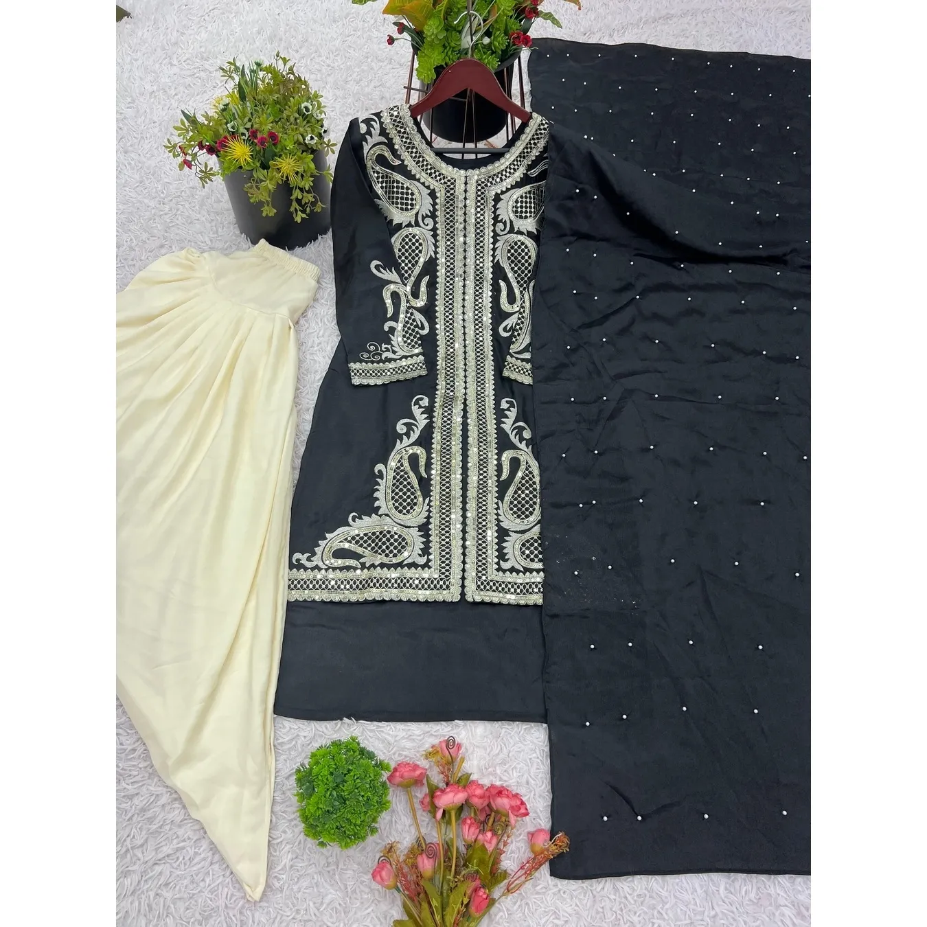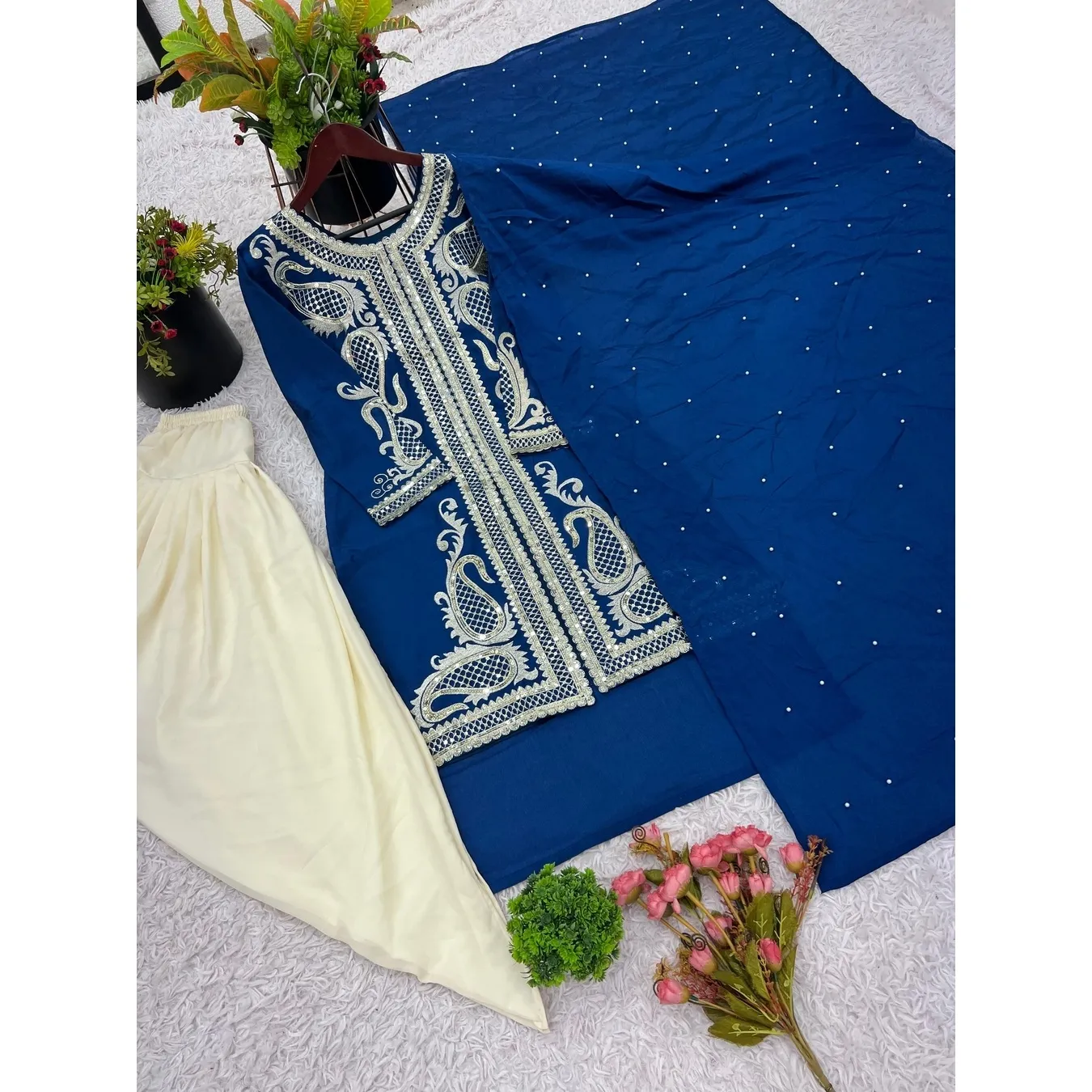 Fabric Description | Top : Heavy Chinon Silk With Embroidery Sequence Work Inner : Micro Cotton Dhoti Salwar : Heavy Faux Georgette With Embroidery Sequence Work Inner : Micro Cotton Dupatta : Heavy Chinon Silk With Rivet Moti |