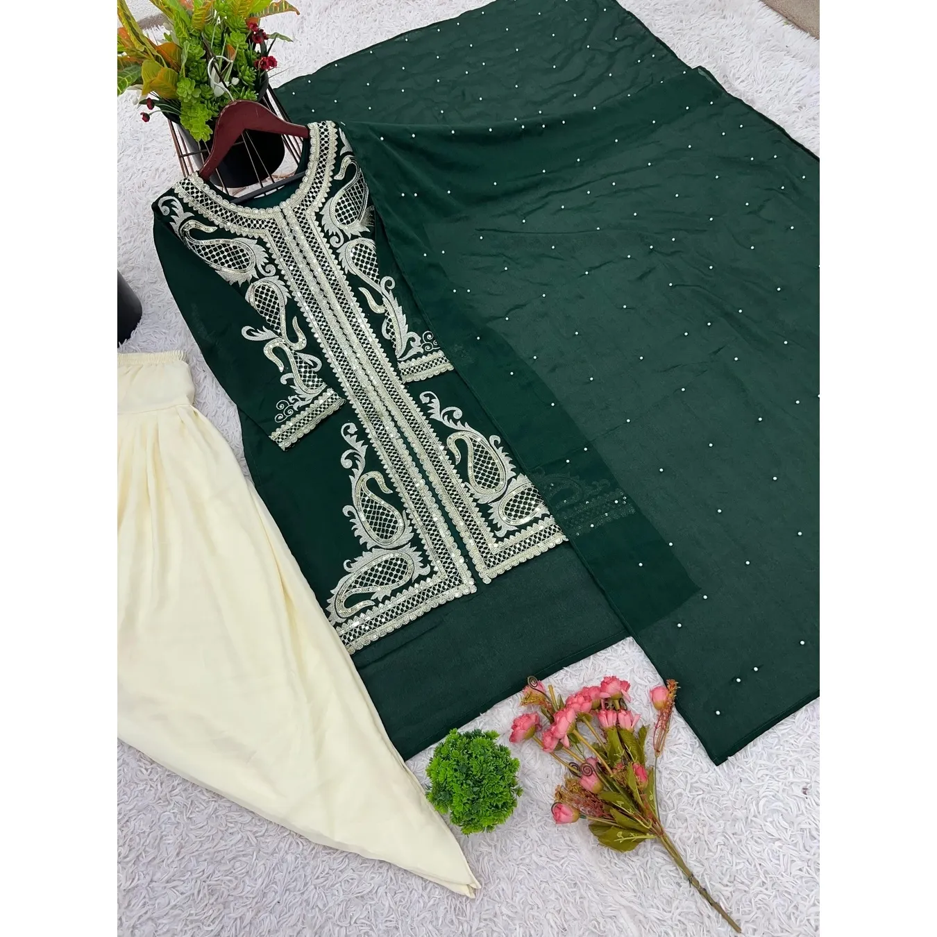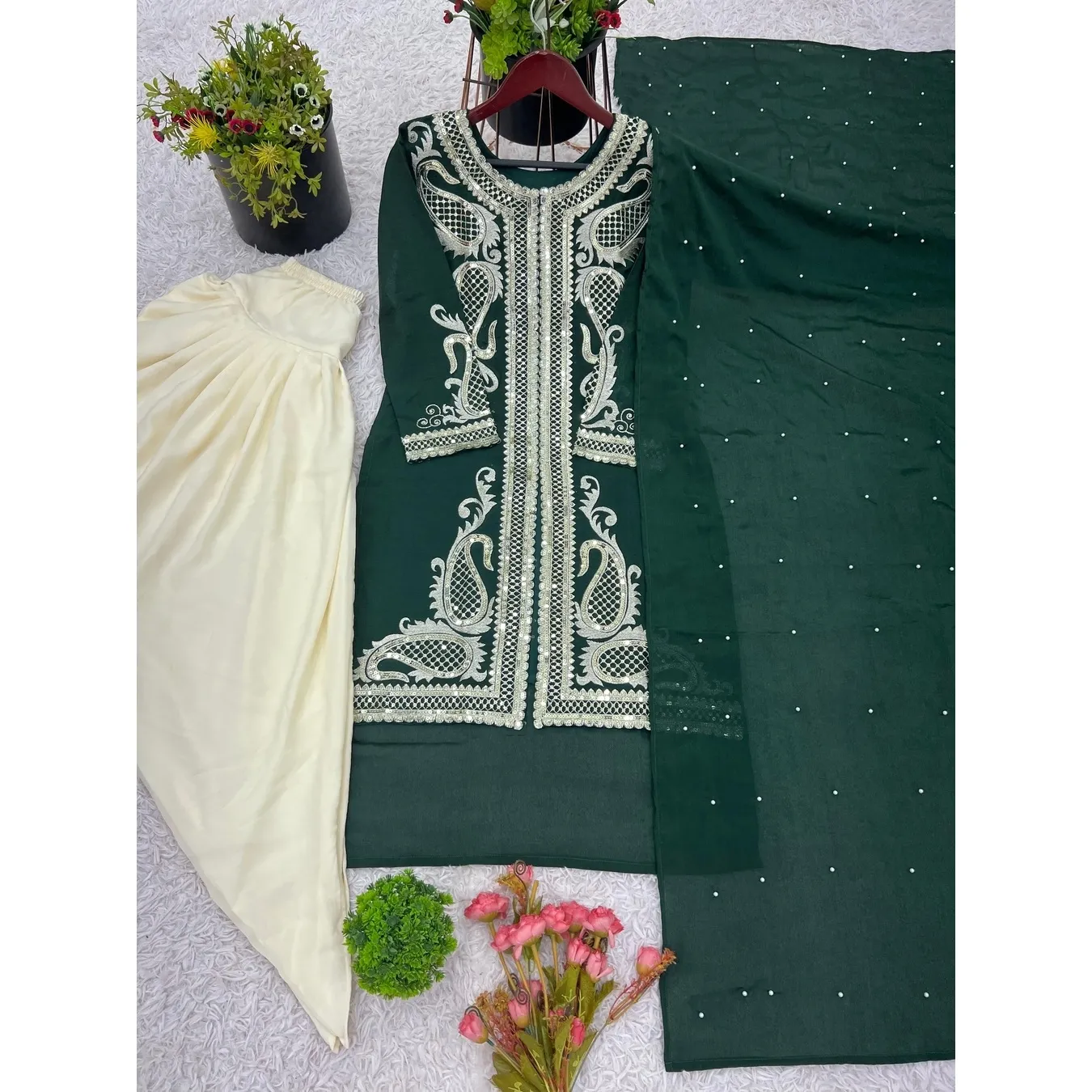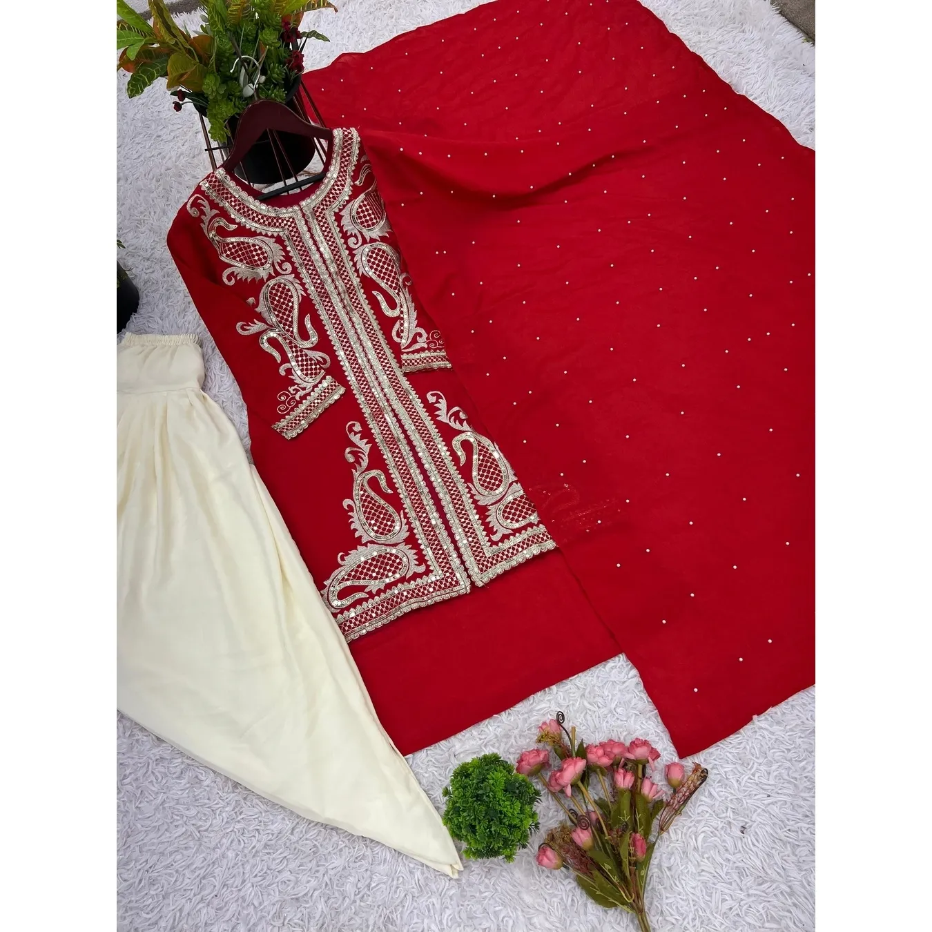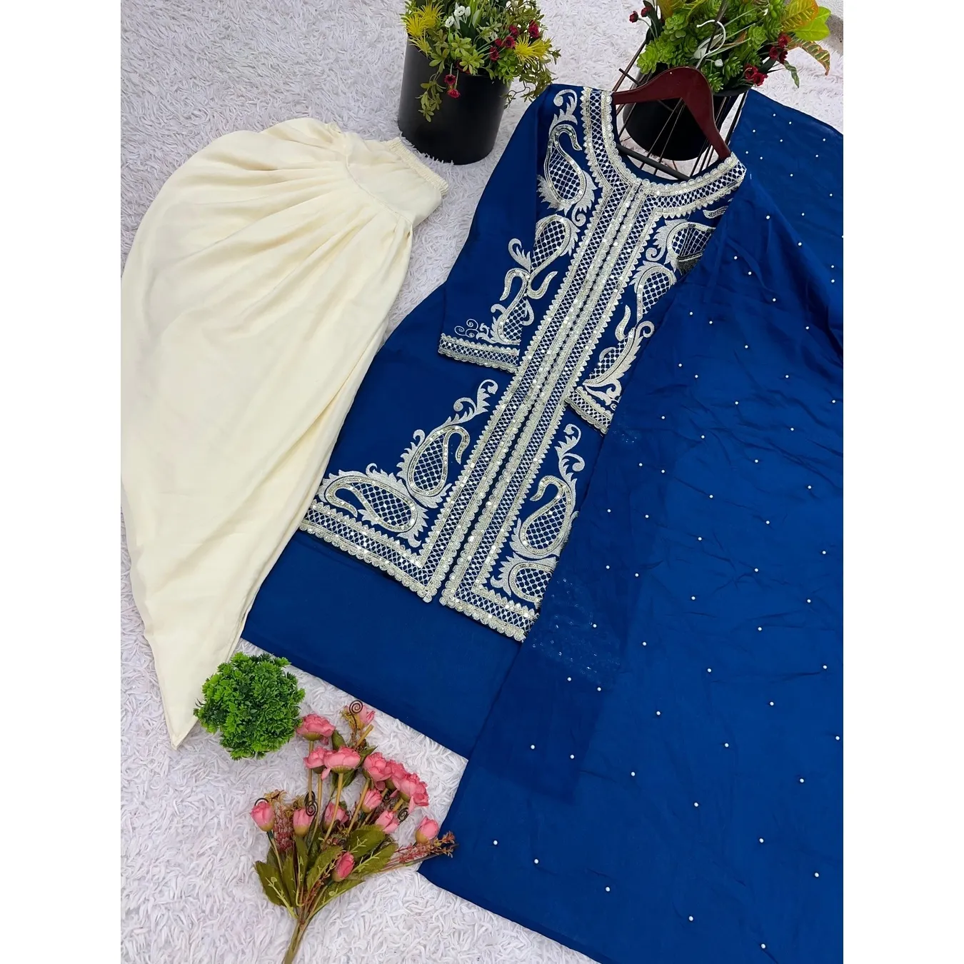 Fabric Description | Top : Heavy Chinon Silk With Embroidery Sequence Work Inner : Micro Cotton Dhoti Salwar : Heavy Faux Georgette With Embroidery Sequence Work Inner : Micro Cotton Dupatta : Heavy Chinon Silk With Rivet Moti |