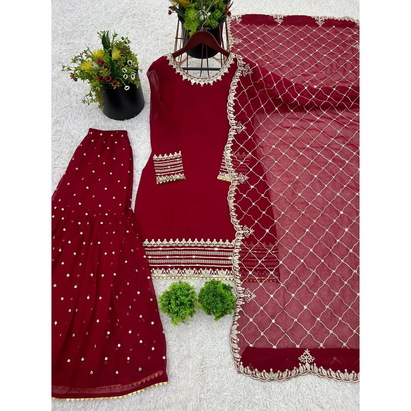 Fabric Description | Top : Heavy Faux Georgette With 5mm Embroidery Sequence Work With Full Sleeve Top Inner : Heavy Micro Cotton Gharara : Heavy Faux Georgette With 5mm Embroidery Sequence Work Pent inner : Heavy Micro Cotton Dupatta : Heavy Faux Georgette With 5mm Embroidery Sequence Work |