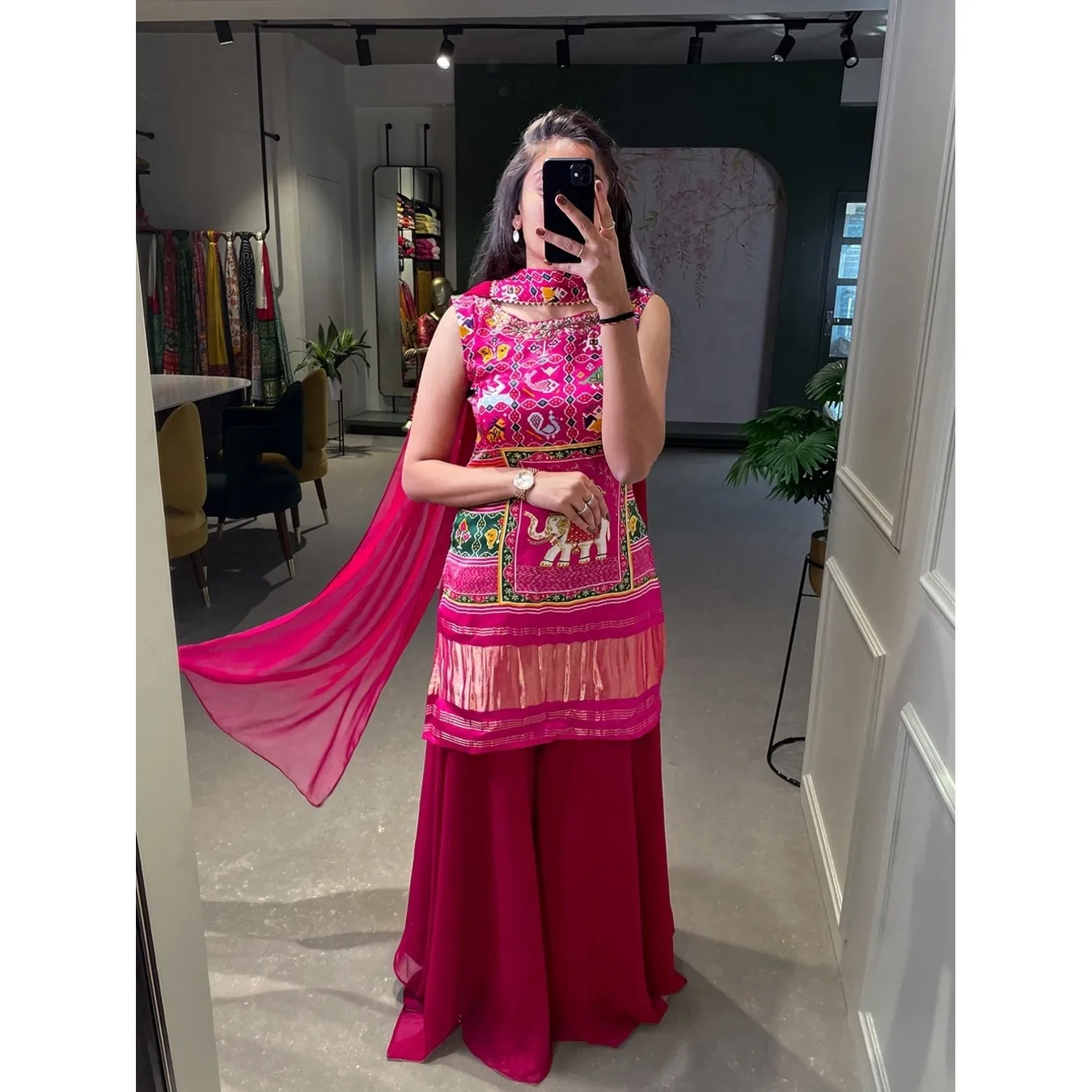 Fabric Description | Top : Gaji Silk Printed and Handwork Plazo : Georgette Plain Dupatta : Georgette Printed With Plain Package Contain : Kurti, Plazo, Dupatta |