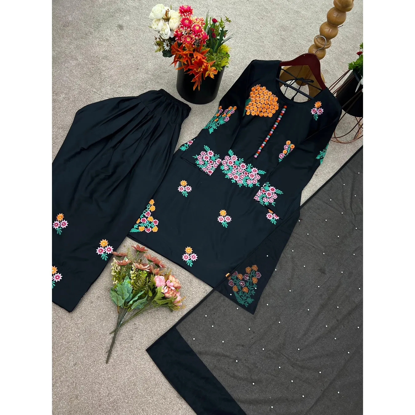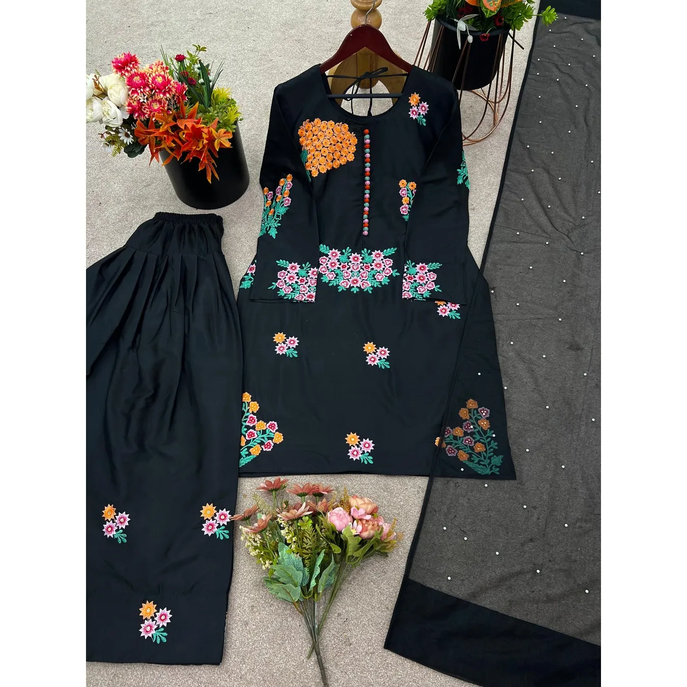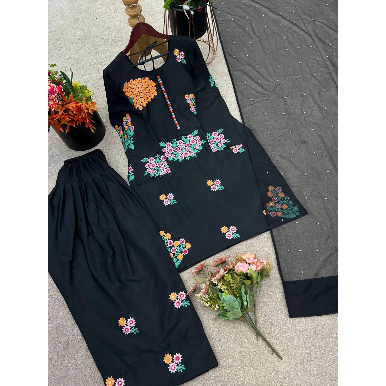Presenting New Designer Collection In Natural Crep Silk Top-Bottom And Dupatta Set Fully Stitched Ready To Wear