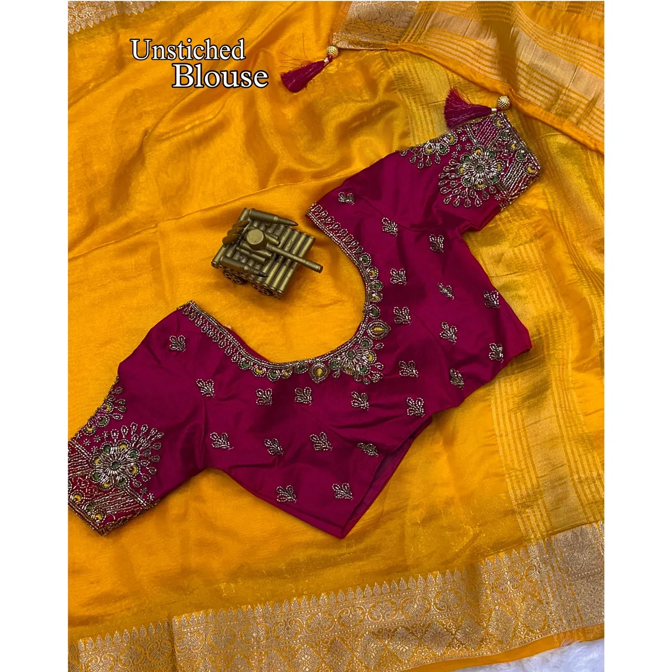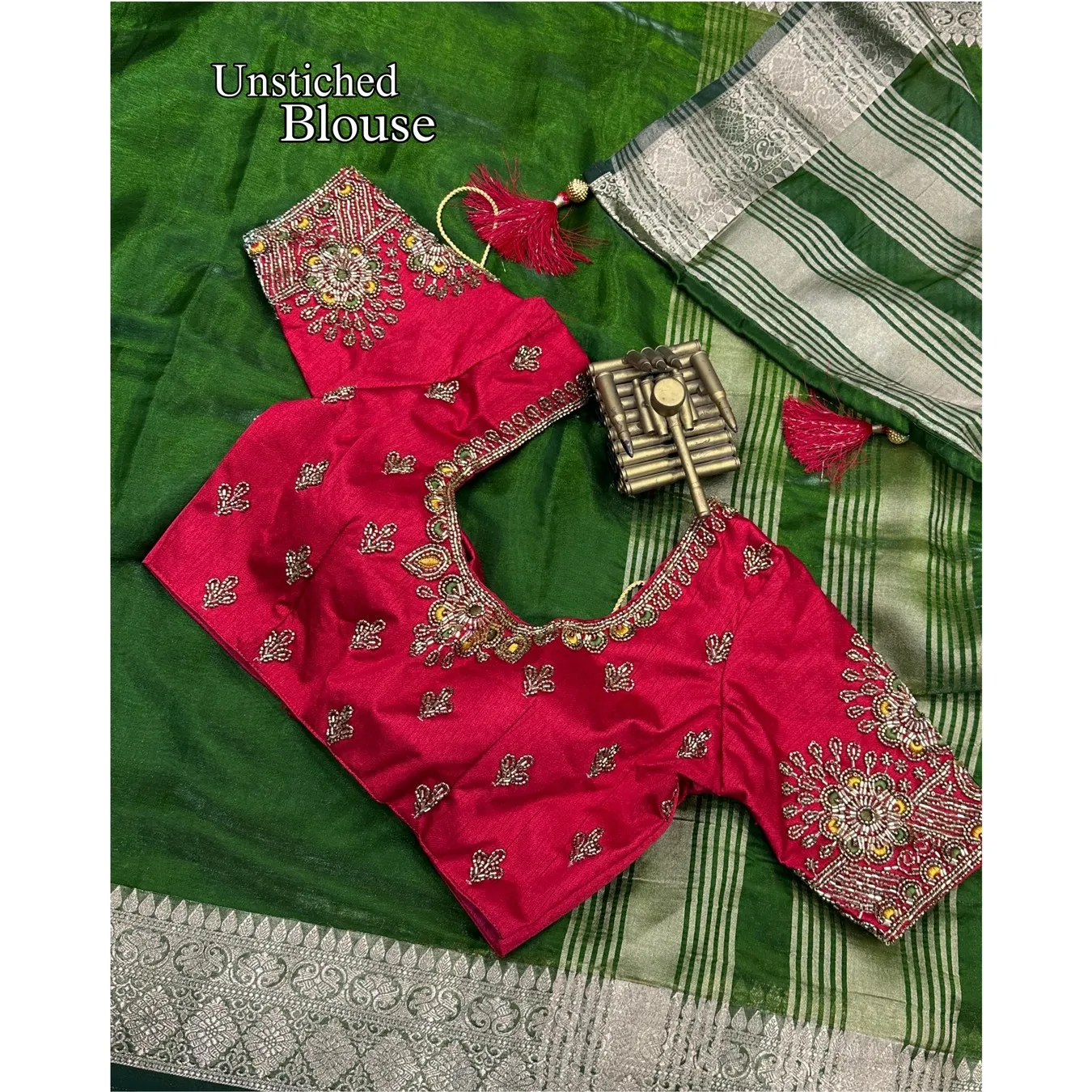 | Fabric Description | Saree : Fandy Satin Blouse : Minzari Cotton Pattern :- 1 : Zari Jacqaurd Weaving In Full Saree With Chitt Pallu 2 : Golden Bids Heavy Handwork Blouse 3-contrast Color Thread Work In Blouse 4 : Tussles In Saree Pallu |